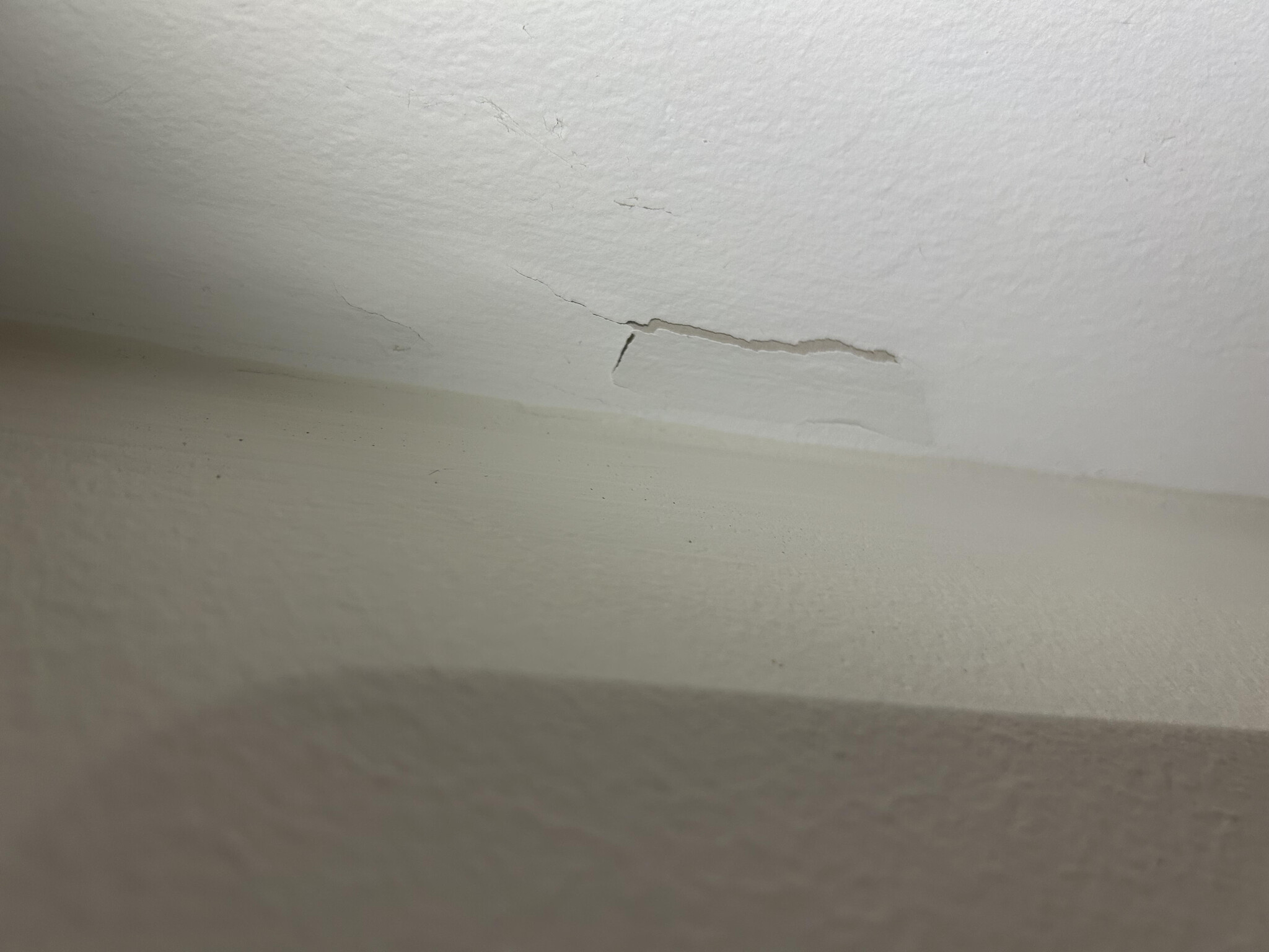 Jag undrar vad som kan ligga bakom att färgen släppt såhär uppe vid taket, längs väggarna? Färgen har sprickor i sig och är lite bubblig (se bild 3).