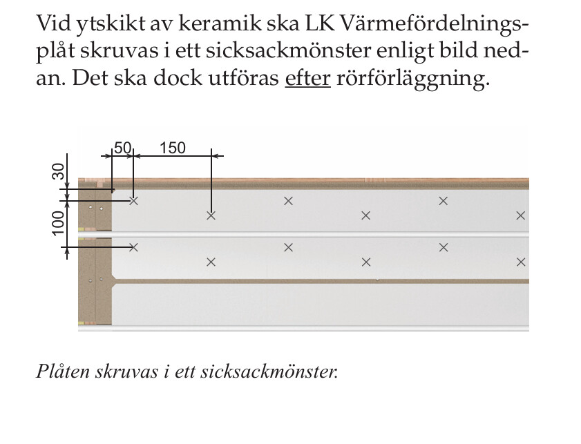 NU vet man ju inte då vi inte ser allt. men frågan är ju också om de lagt armering. TS borde kanske leta lite spår om de klippt till armeringsnät. Nedan är uppbygganden enligt LK. Bild två hur plåtarna sakll skruvas. mao ordentligt mycket mer än vid vanlig golvläggning med värmeplåt.
