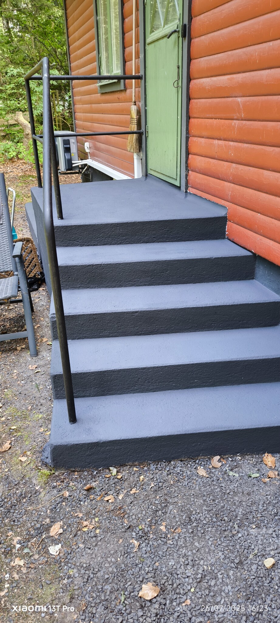 Jag är inte alls en aktiv person utan mer av typen "kan jag göra det nästa år så kan jag ju vänta" men tänkte att semester i 30 dagar kan ju utmynna i projekt "måla trappa" då all vit färg hade flagnat av under 20 års tid. Byggmax fick ett besök och ljusgrå färg (light gray) för betong inhandlades eftersom jag tänkte att det kunde ju vara snyggt och ha trappan som en färgklick och lite avvikande.