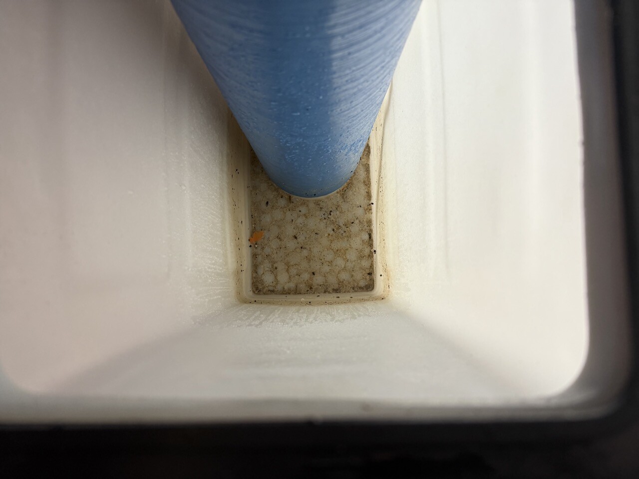 I pumprummet upptäckte vi att det “läcker” klart vatten via en slang från en vit plastbehållare, som kanske heter BWT MIDI-B från HOH Vattenteknik — etiketten är svår att tyda. När vi lyfte på locket såg vi insekter, löv och gegga i botten — knappt något vatten kvar. Vi har googlat och sökt här i forumet, och tror oss nu veta ungefär vad som behöver göras. Men vi vill stämma av lite först.