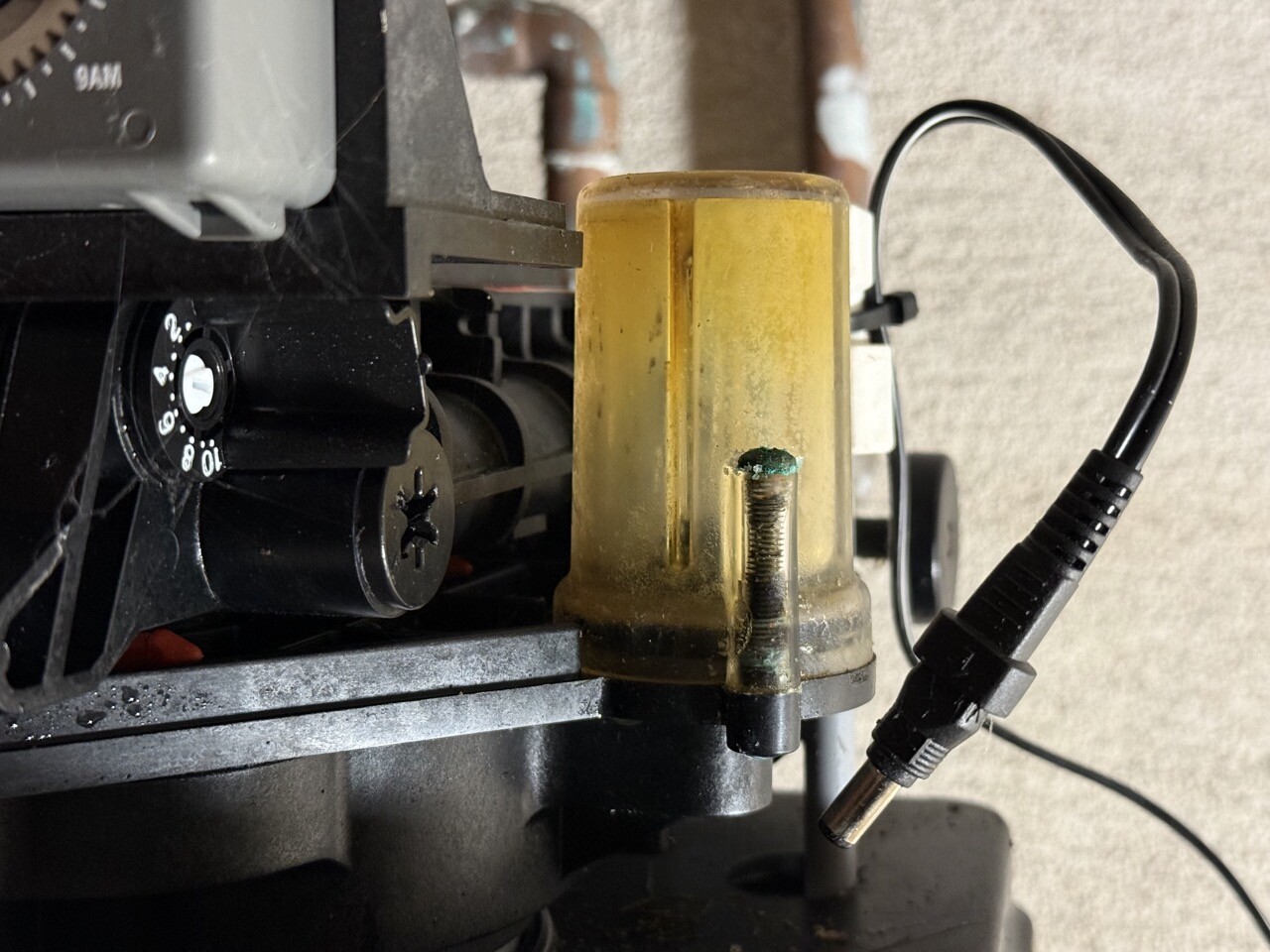 Vi misstänker att det handlar om slut på regenereringssalt. Vi ser inget salt i behållaren, men det finns ljusare fläckar i botten som kanske är spår av tidigare saltpellets. Under dagen har vi köpt en 25 kg säck salt i tablettform (Axal Pro), men vi har inte lagt i det än — vi vill gärna rådfråga först.