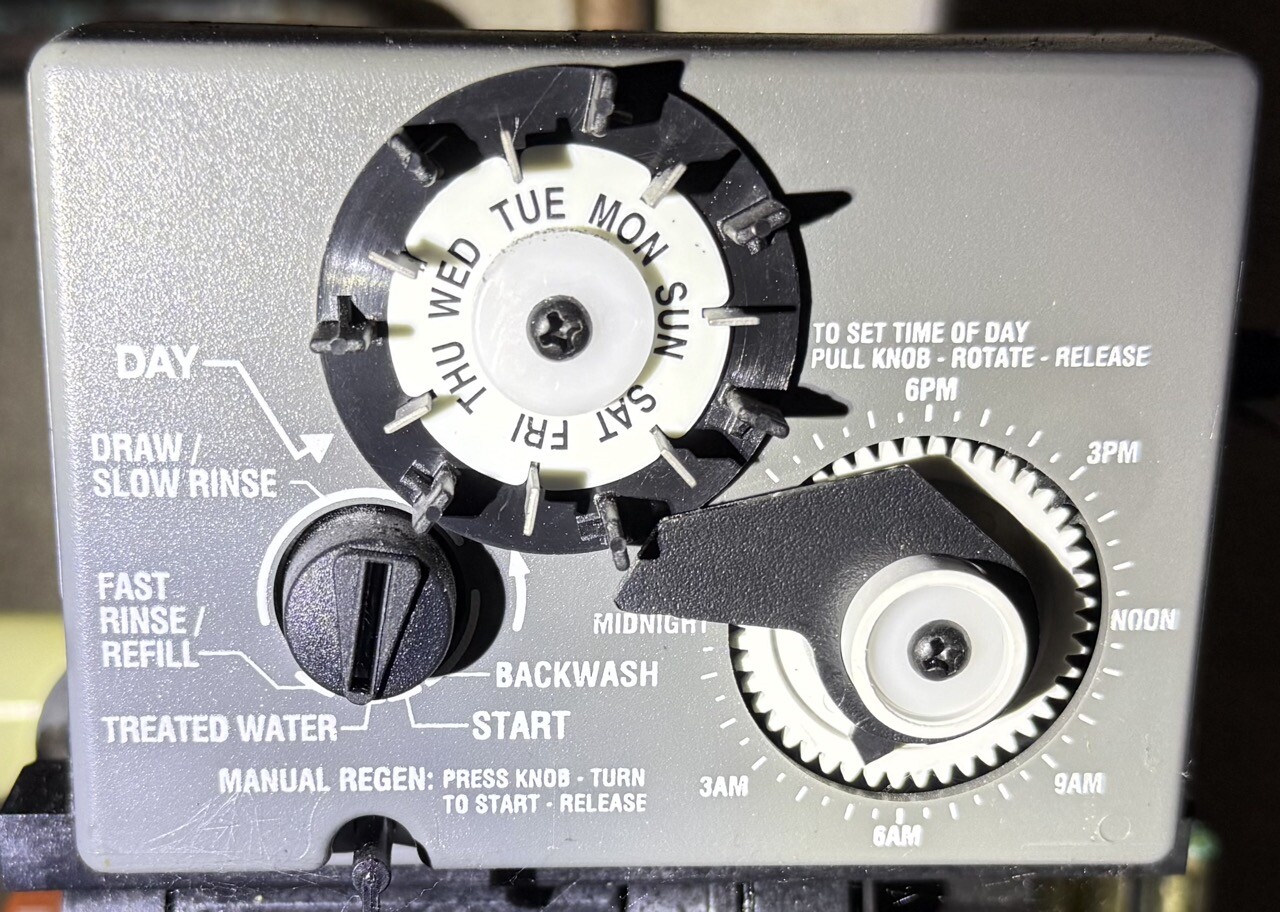 Urtavla och manöverpanel. Vredet nere till vänster, som pekar mot treated water, ska det användas för att starta en slags process / cykel i och med påfyllning av salt?