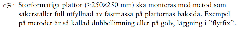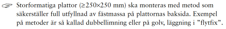 Behöver få bekräftat bara att det är så att man alltid ska bakstryka stora plattor för då är det uppenbarligen felet. Jag har reklamerat allt, jag hade 5 extra plattor som de nu förbrukat på de som lossnat. Nu har fler plattor lossnat. Dras förslag på åtgärd är att knacka bort all klinker och lägga ny utan att byta tätskikt, är det verkligen ok?Hojte skrev: