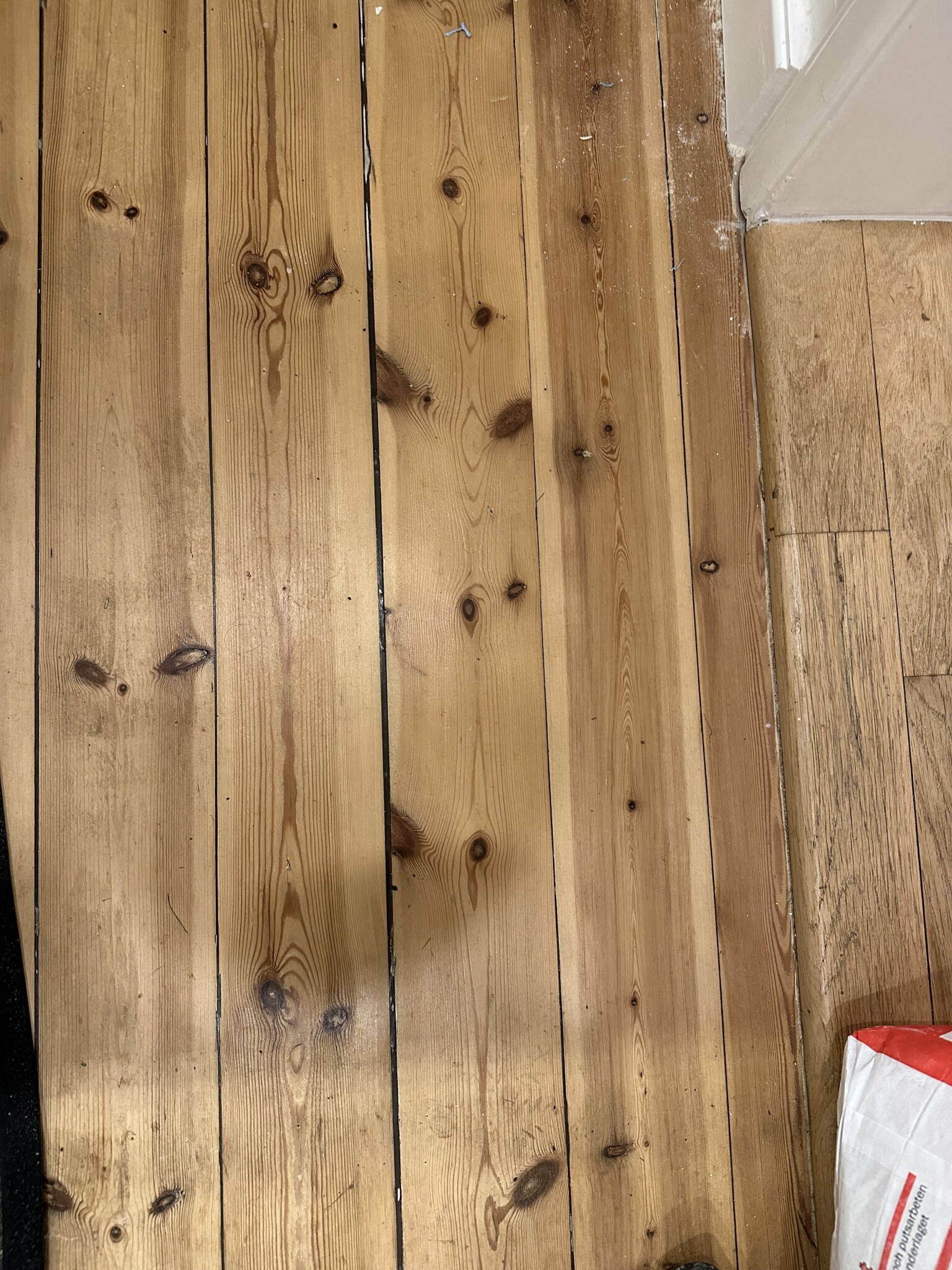 Slipade om mitt köksgolv (gran, tidigare lackat). Lackade med polyuretanlack, luktfri. Men efter c:a 3 månader, började det dyka upp fula mörka fläckar….. golvet ser smutsigt ut. Att notera är att den del av golvet som täcktes av en dörrmatta (bild 2) inte fick fläckar….. UV-relaterat?