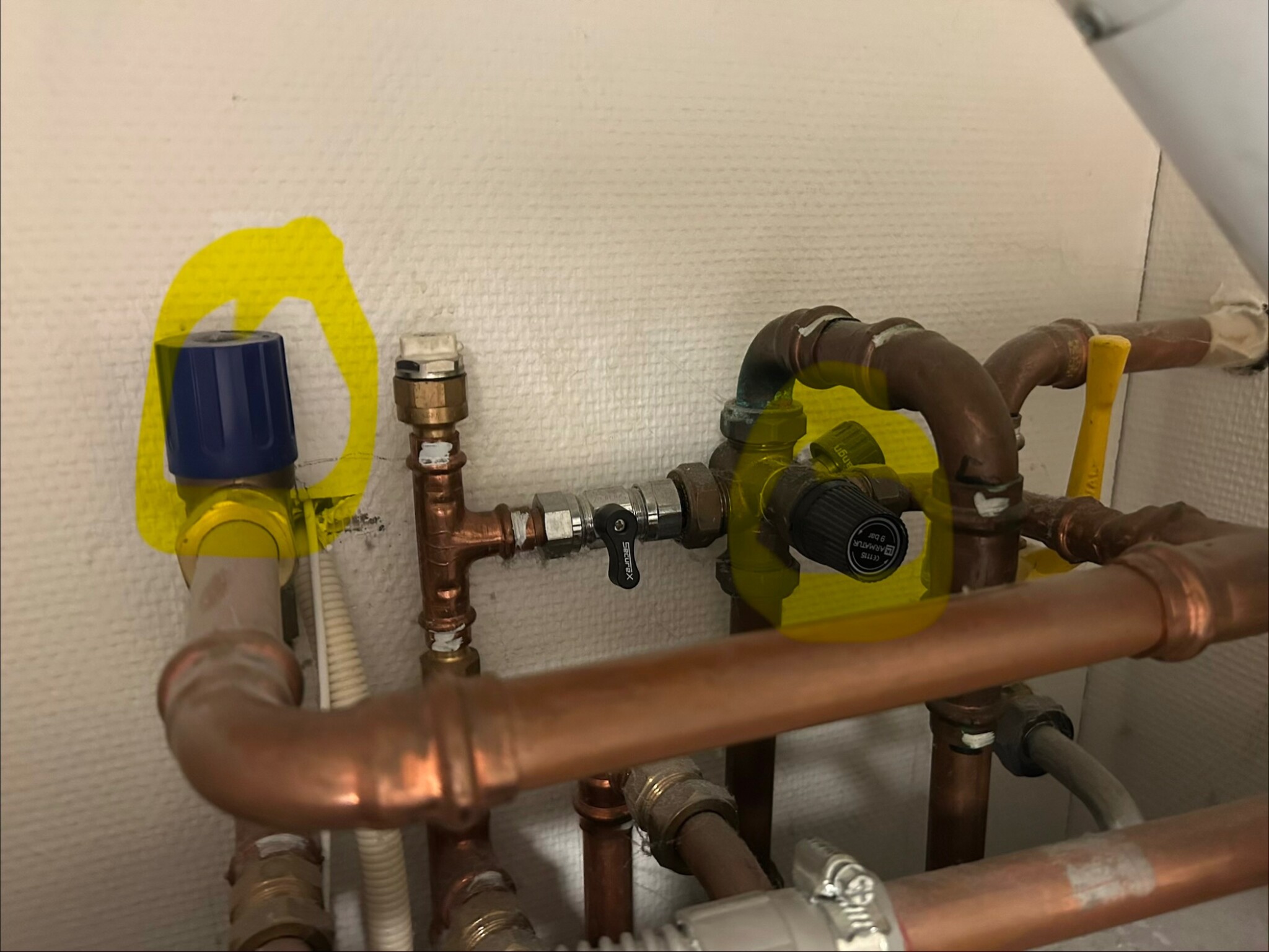 När jag kom hem idag hörde jag hur det droppade från avrinningsröret. Har därefter testat att motionera säkerhetsventilerna (se markering på bild) men nu upplever jag att det rinner lite mer.