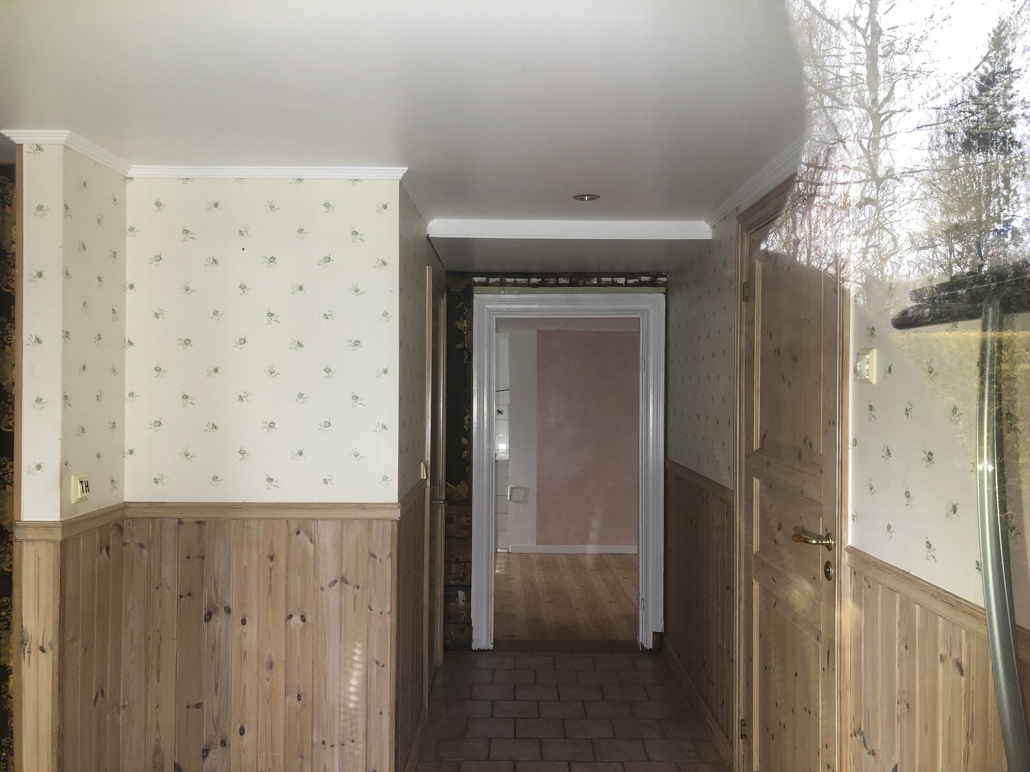Taget in genom hallfönstret. Ok takhöjd tills köksdörren rakt fram. Kökstaket slår en sedan i princip i huvudet. Den uppmärksamme ser här hur plankgolvet/taket har bågnat nedåt: