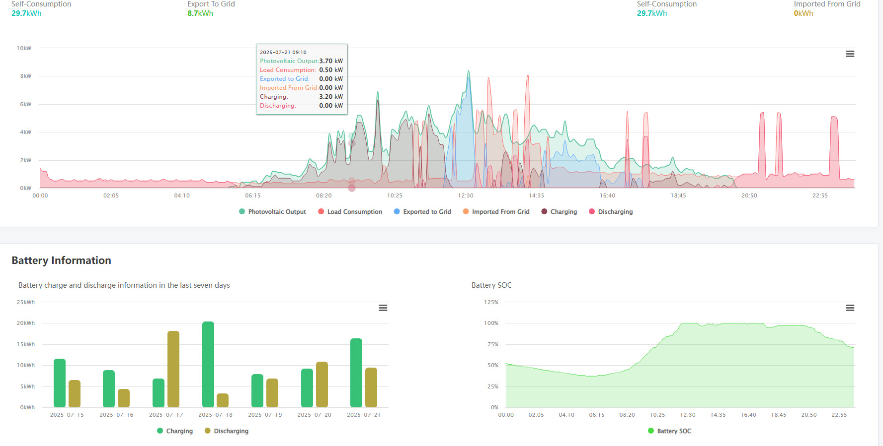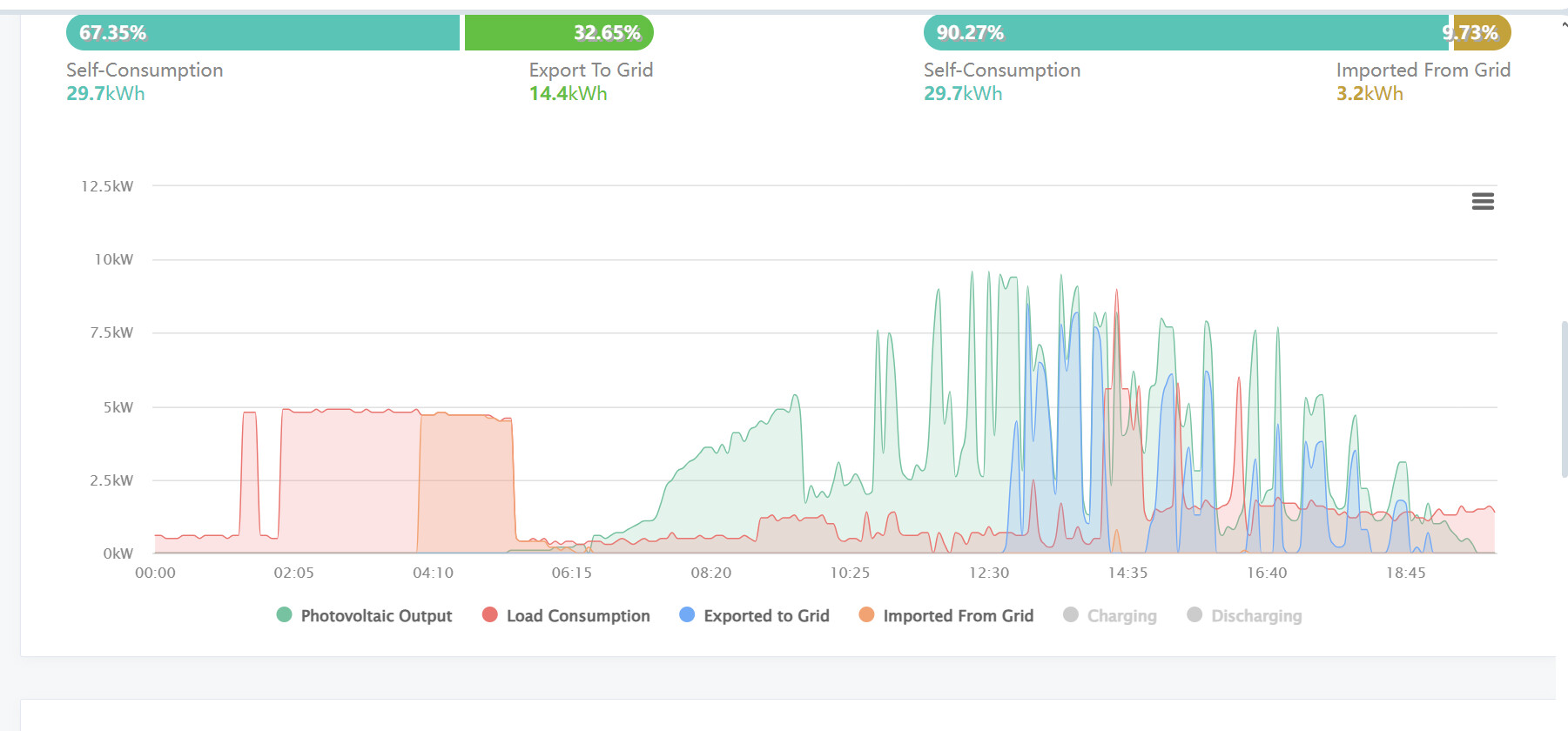 Det skulle kunna vara den gamla klassikern med smartmätaren. Men svårt att avgöra i grafen, vilken färg som är vad. Kan du skicka samma igen och dölja bort charging och discharge?J Jonas Svensson4 skrev:I growatt appen som du ser visar den oftast noll i imported from grid. Bilden var exempel.