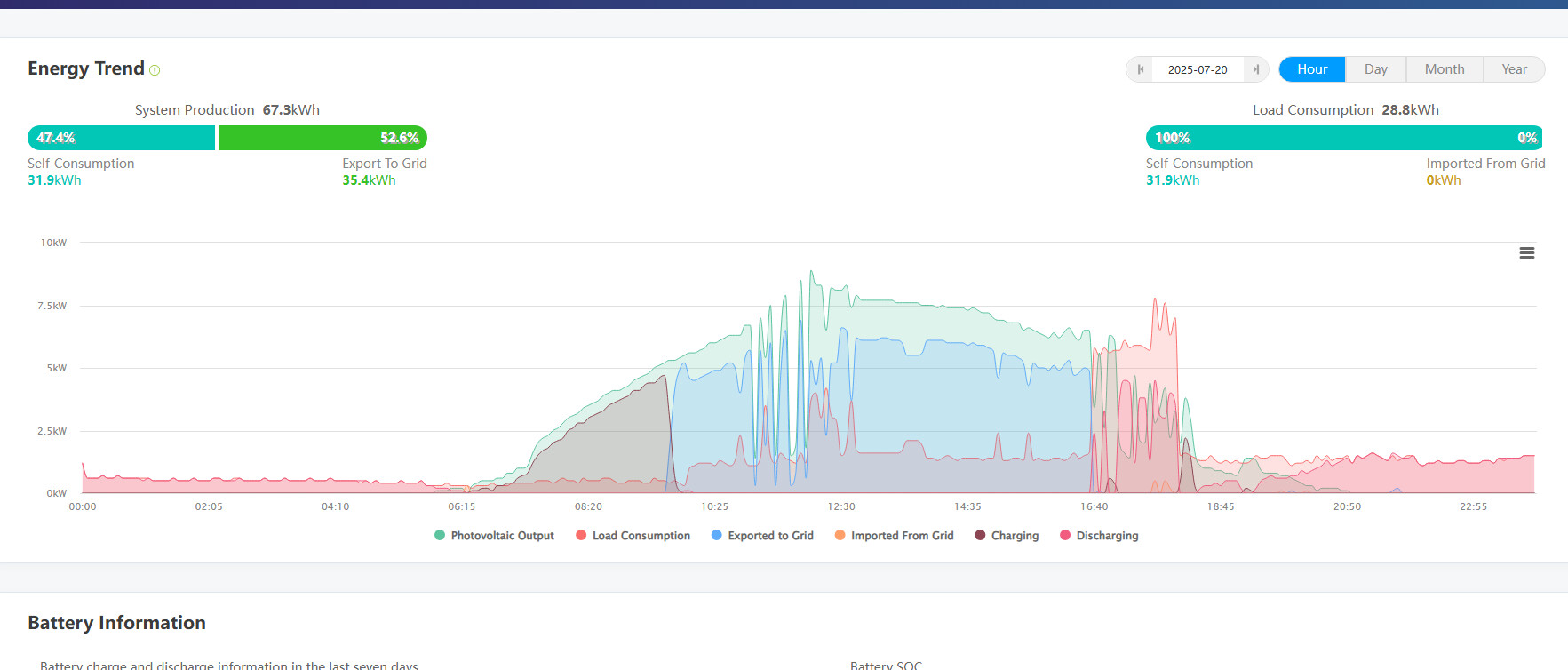 Man ser det sakta laddar ur och hans "load" är blygsam på natten nu på sommaren, när morgonen kommer är det cirka 65% kvar när morgonsolen kommer och den börjar producera igen och den laddar batteriet igen.