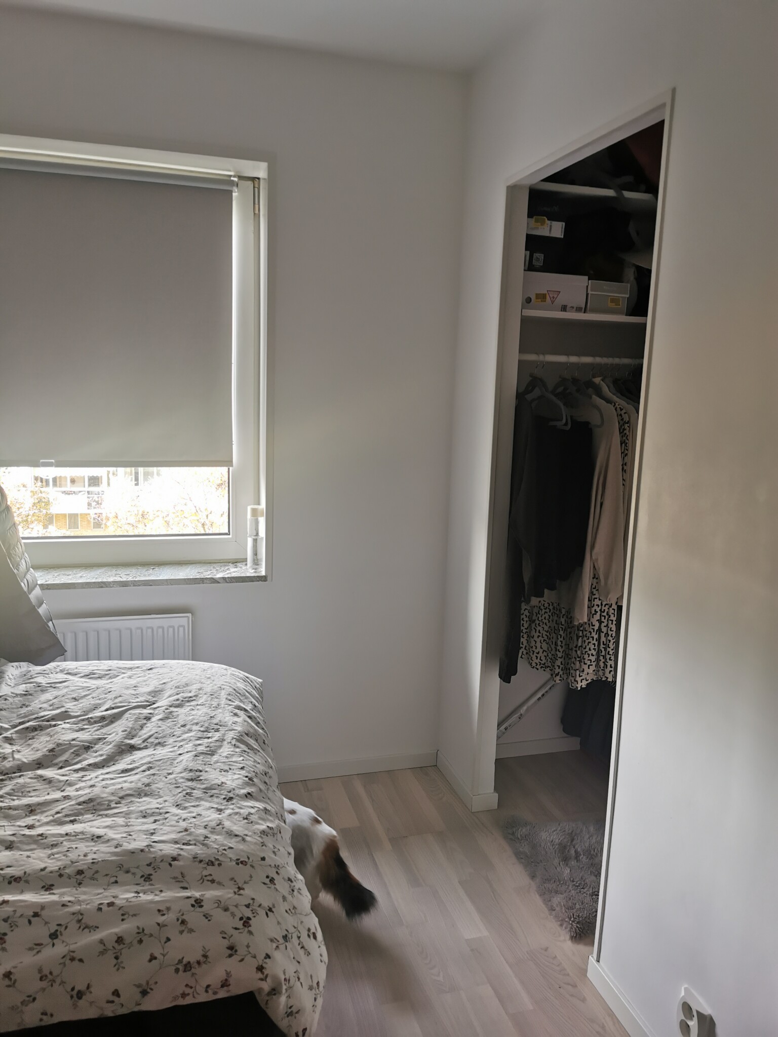 Det fanns tidigare en dörr till garderoben men efter renovering passade den inte längre in (inget jag vill sätta in igen då en dörr bara är i vägen). Satte in en skjutdörr (dragspelsliknande) från Hornbach som efter ett tag gick isönder och det kom alltid ut kalluft på under och ovansidan. Förra vintersäsongen satte jag upp något som såg ut som en tjock gardin men det såg hemskt ut! Nu funderar jag på om det funkar att sätta upp vanliga gardiner (kanske lite tjockare sådana) som täcker både mitt fönster och sedan svänger ut en bit på höger vägg. Tror ni det hade funkat?
