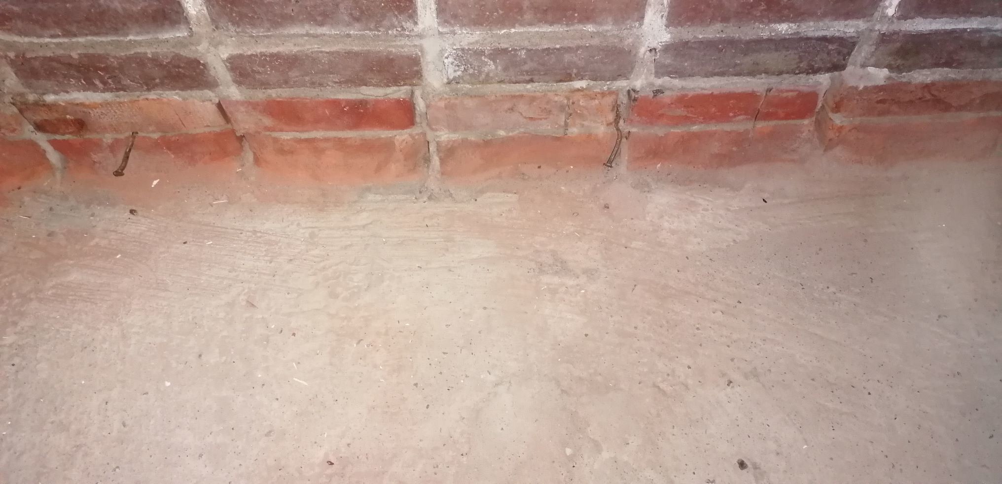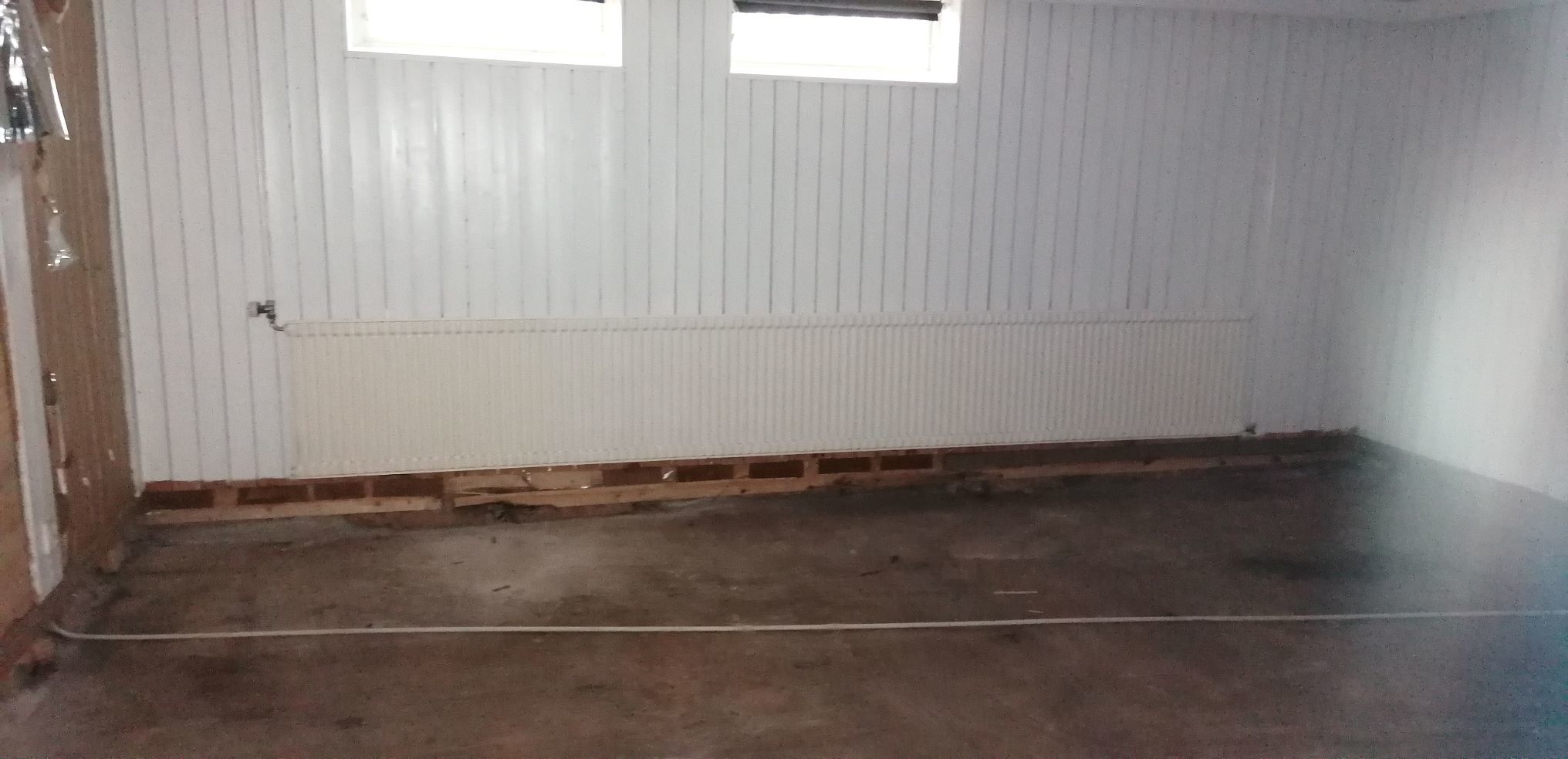 Gamla golvet är utrivet, låg på träreglar med tryckade distanser och gullfiber direkt på den relativt ojämna plattan. Rummet har hitintills varit kraftigt unermåligt avseende ventilation och plattan visade tecken på fukt vid demontering.