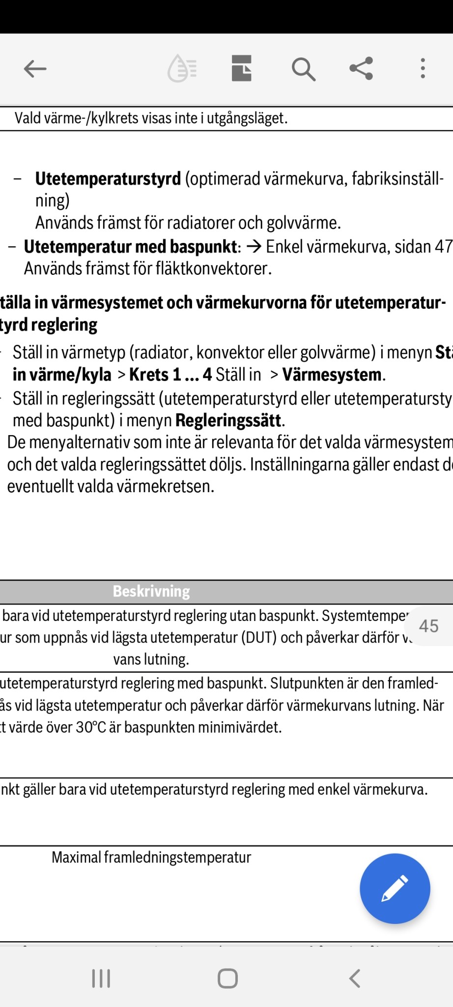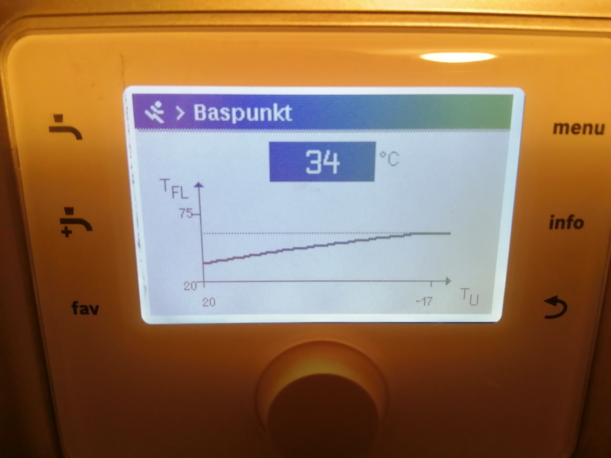Jag har lite problem att få värmekurvan rätt inställd. När det är kallt ute så blir det för kallt i huset och när det varmt ute så blir det för varmt inomhus. Vad kan en normal inställning på framledningstemperaturens baspunkt vara för ett enplanshus med radiatorer? Jag sätter in lite bilder där ni kan se allt man kan justera, så kanske ni kan hjälpa mig!
