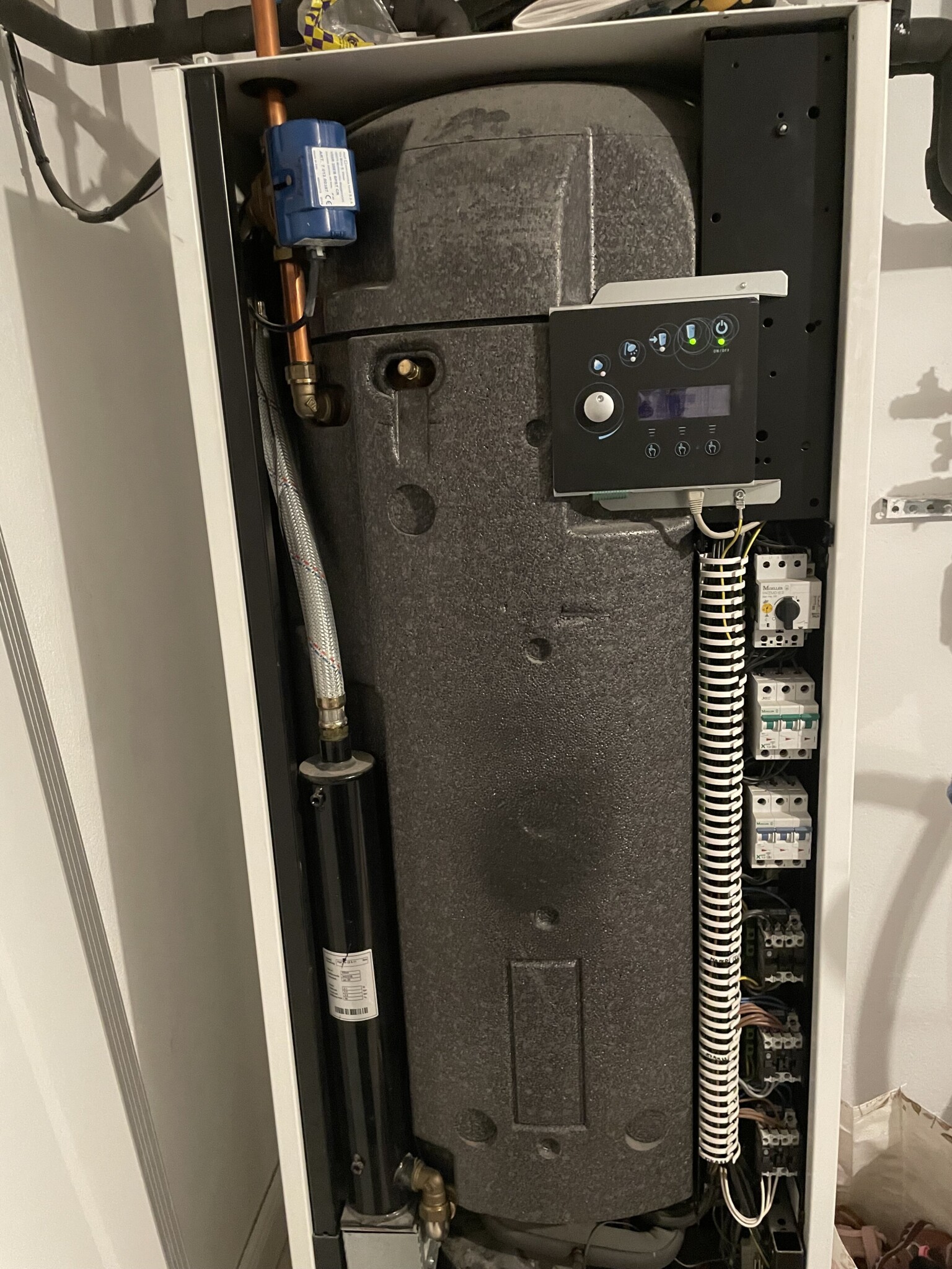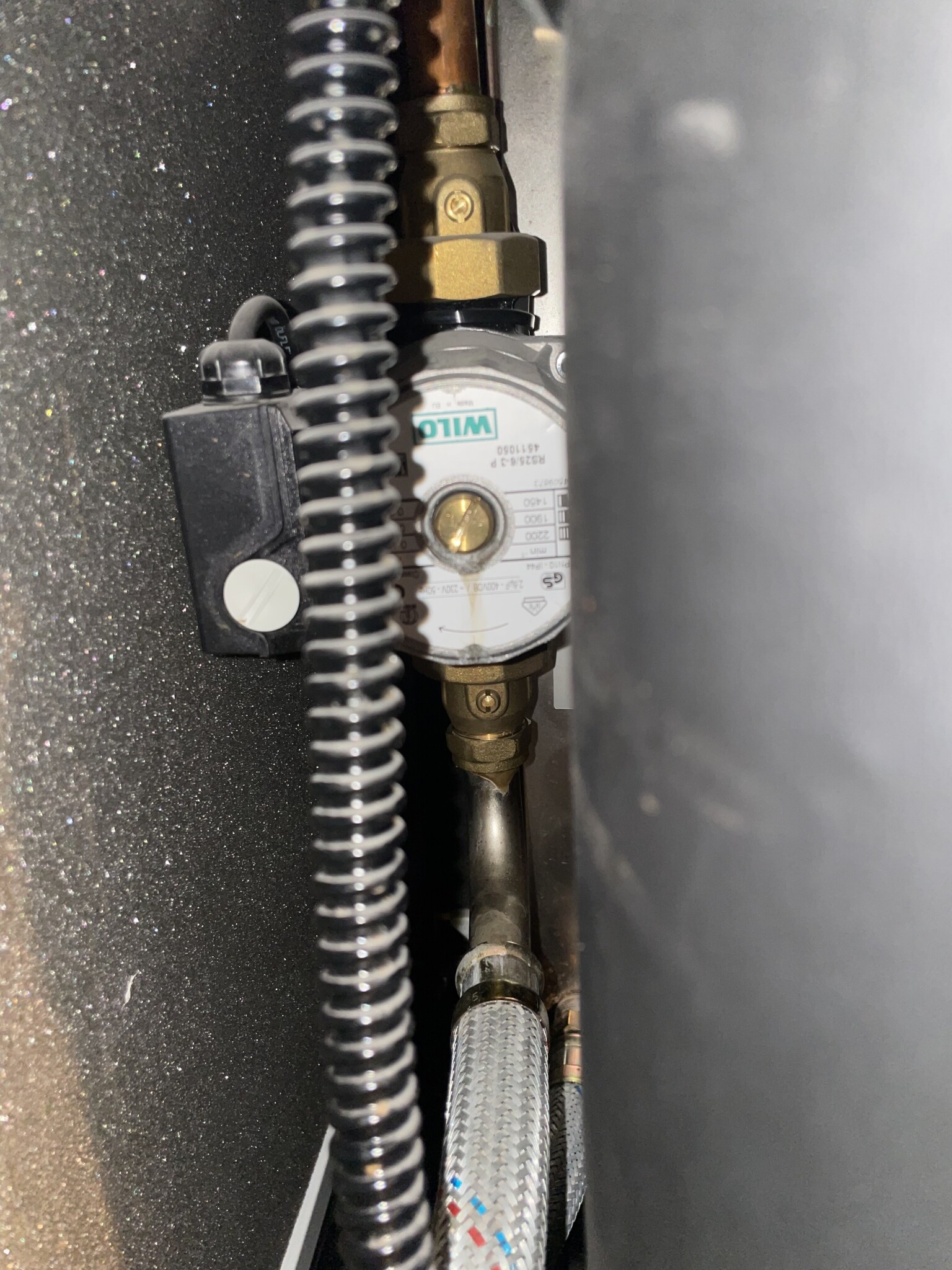 Är det trycket ut i systemet då, eftersom att värmen kom igång. Det ska inte pysa något där. Verkar som att det är ett vacum och då går det ut vatten på något ställe. Sjunker trycket nu med. Finns dett någon väta under VP. Ett foto längre ifrån så det går att se placering av cirkpumpen, sitter säkn efter llr före pumpen.A Anders Larsson8537 skrev: