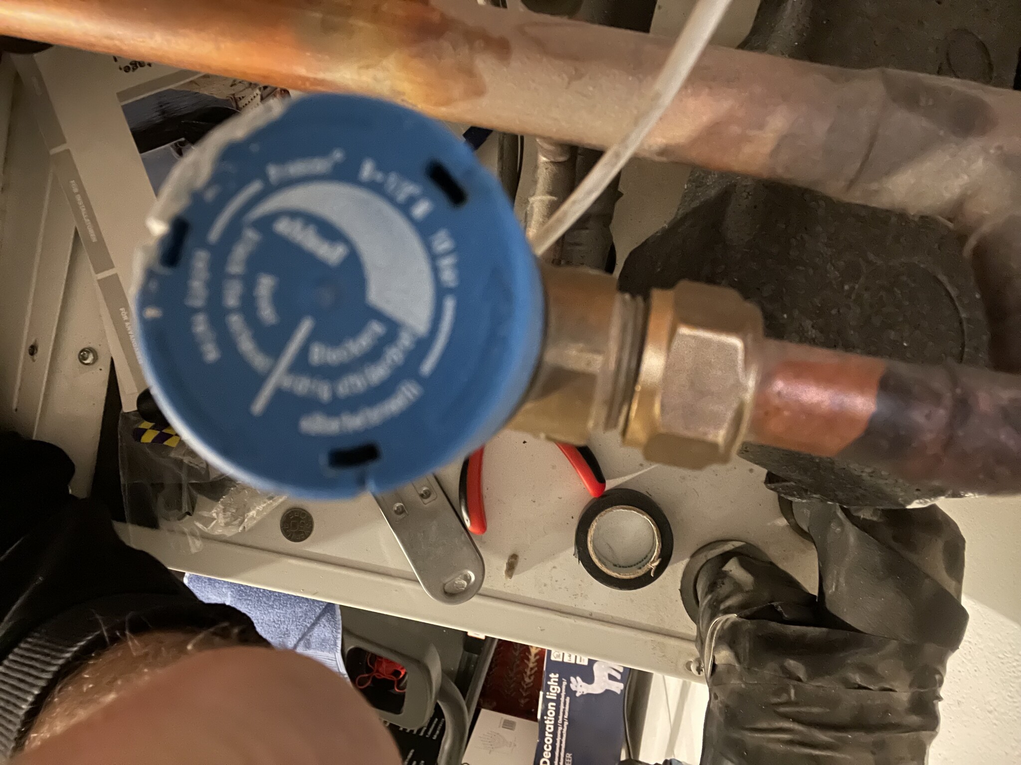 Det med dåligt tryck på det från borrhålet, glöm det nu för det fungerar. Viktigaste nu är att trycket står kvar, efter fyllning, manometern visade 1,2 bar och normalt. Vad står det på den blå, den ventilen som pyser, 1,5 bar eller.