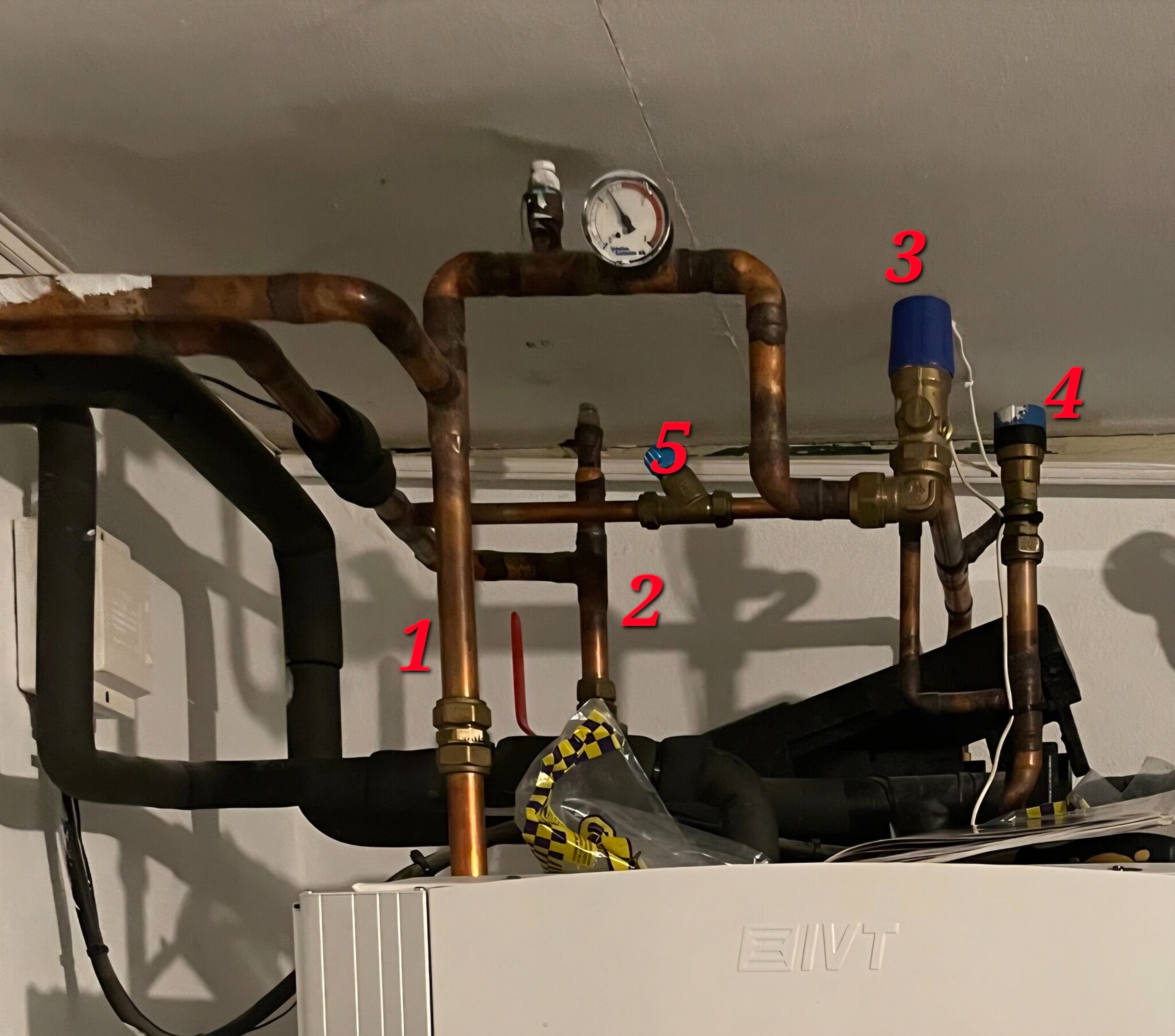 5 = påfyllningsventilen till värmesystemet, från tappvattnet.