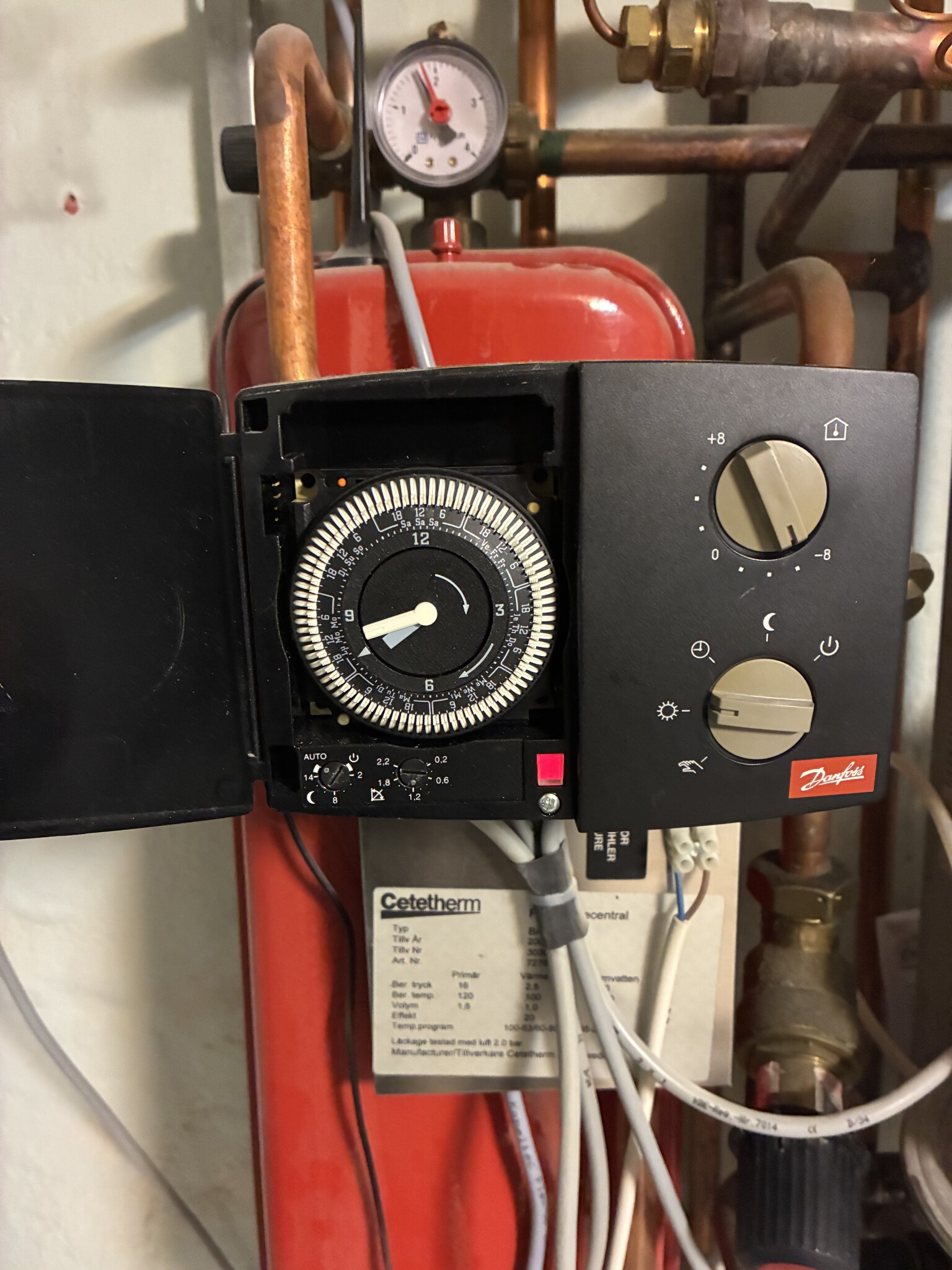 Öppna luckan till vänster på reglercentralen (svarta Danfoss burken med två vred), ta ett kort på vreden i neder.