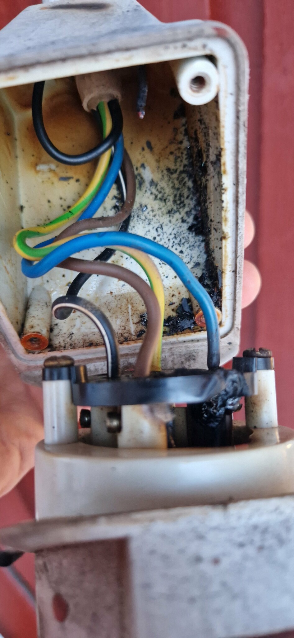 Det låter som om uttaget varit otätt, t.ex om det är anslutet uppifrån, så att det runnit in vatten, alternativt kondens. Detta i kombination med dåligt åtdragen skruv. Det finns inga skydd mot sådant. Du bör ersätta uttaget med en anslutningsdosa, eller säkerhetsbrytare, för fast anslutning av LLVPn.