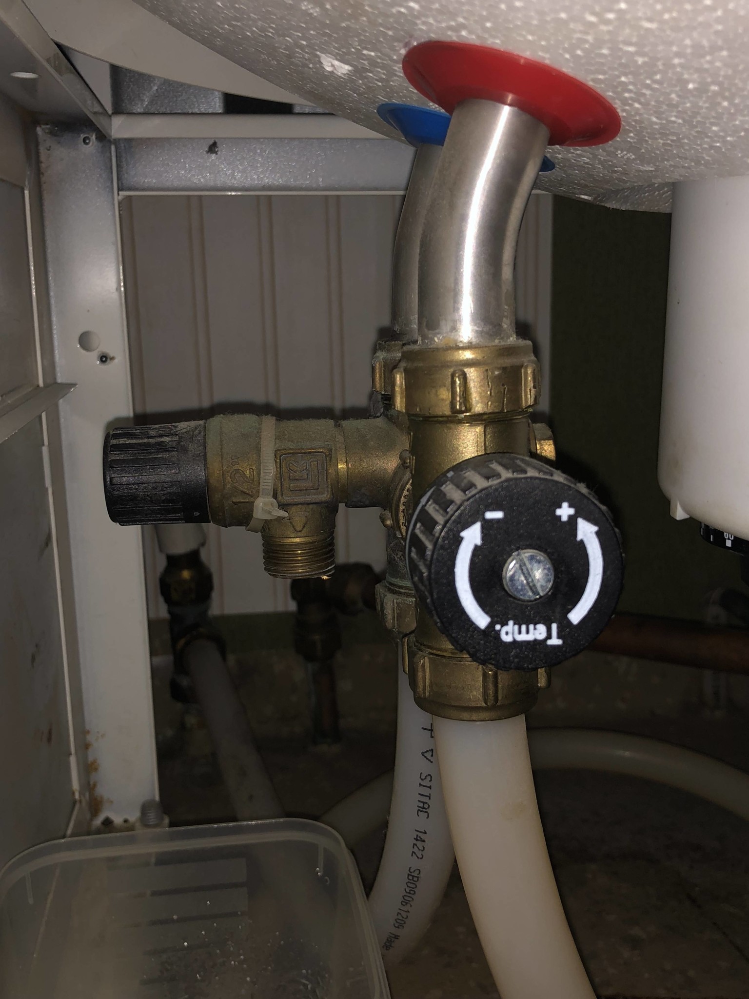 Det är säkerhetsventilen. Den får absolut inte pluggas. Eftersom vattnet i beredaren expanderar när det värms upp så kommer det alltid lite vatten ur säkerhetsventilen, särskilt när man använt mycket varmvatten och det värms upp nytt vatten igen. Därför bör ett rör dras från säkerhetsventilen till exempelvis en golvbrunn eller annat avlopp.