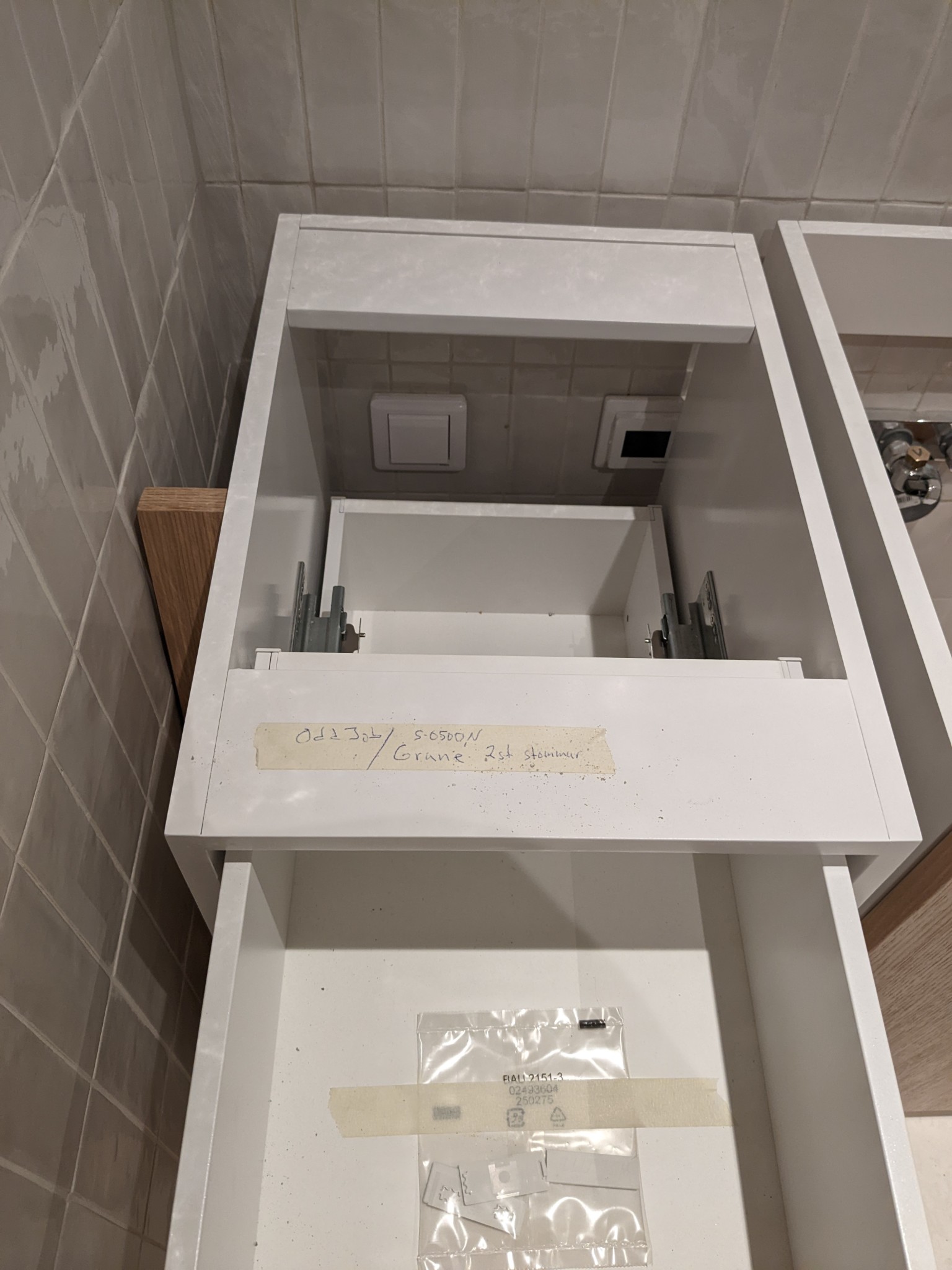 Så vi bad elektrikern montera dessa raychem senz wifi termostater i komoderna/skåpen i badrummen. Problemet med denna är att han satte den sjukt fel. Den sitter dels bakom lådorna så vi inte kan nå den och dels mellan lådor och lucka så skåp och lådor inte går att montera. Helt fel med andra ord.