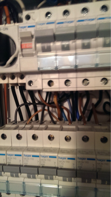 Kanske svårt att se men någon har i centralen dragit från en 10 A säkring till botten på en 16 A säkring. Vidare därifrån matas en 2.5 mm2 som går till en belysningsgrupp. Varför går man från en 10 A säkring igenom en 16 A??