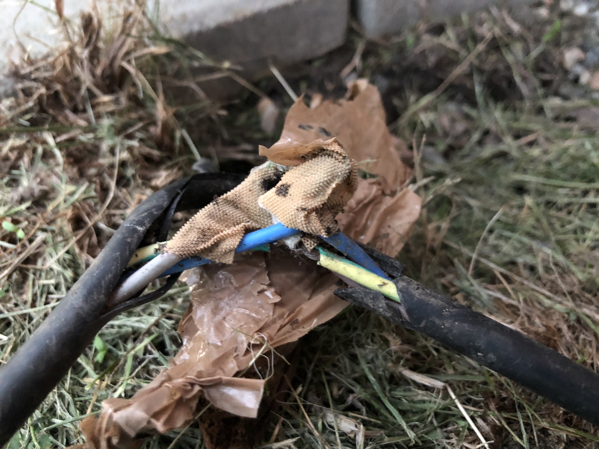 Den nedgrävda kabeln till fontänen, uppfinningsrikt skarvad av min mors personliga assistent.