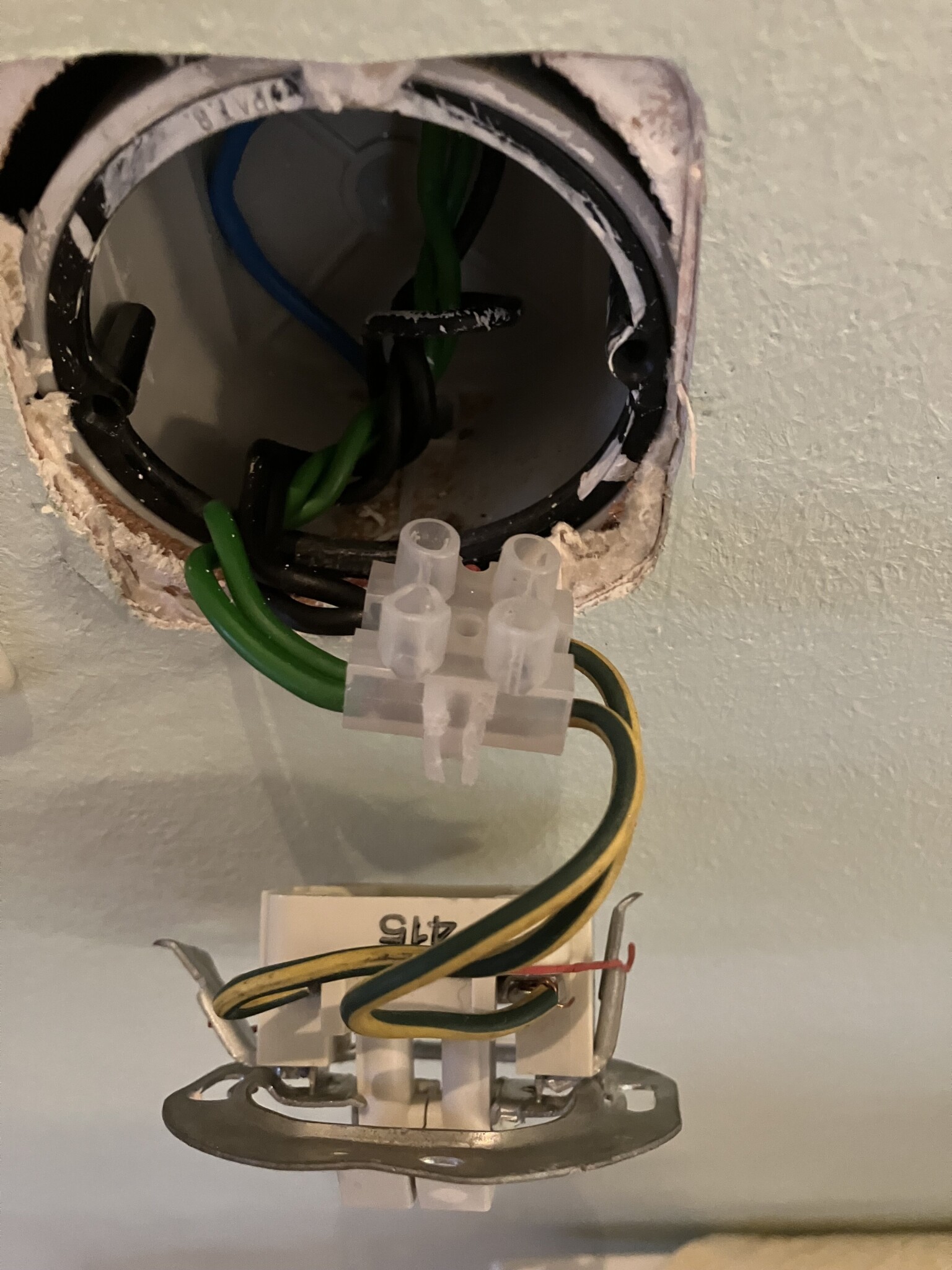 Borde inte svart vara kopplad nedtill på brytaren och sedan de gröna på respektive plint upptill?