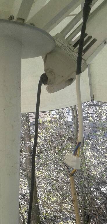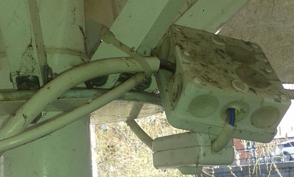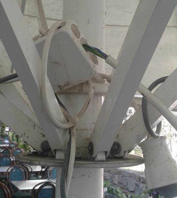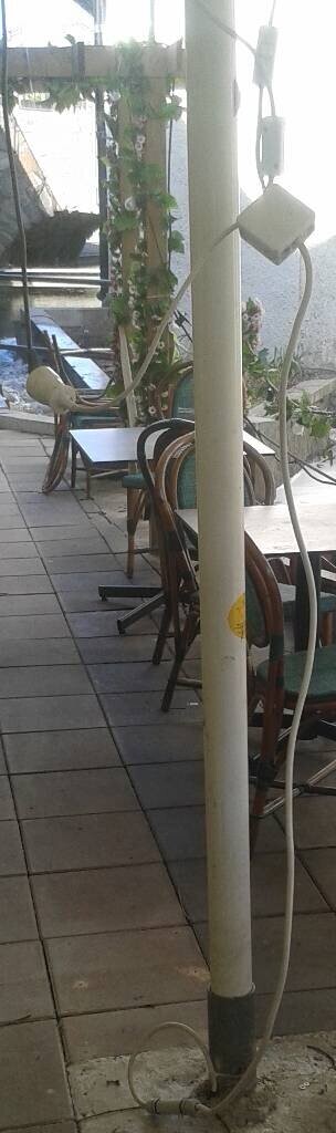 Det här är gamla bilder, uteserveringen på en restaurang, med ett flertal parasoller, sen har de hängt upp infravärmare, 1-3 st i varje parasollstolpe och det hela var installerat som på de bilder jag nu bifogar.