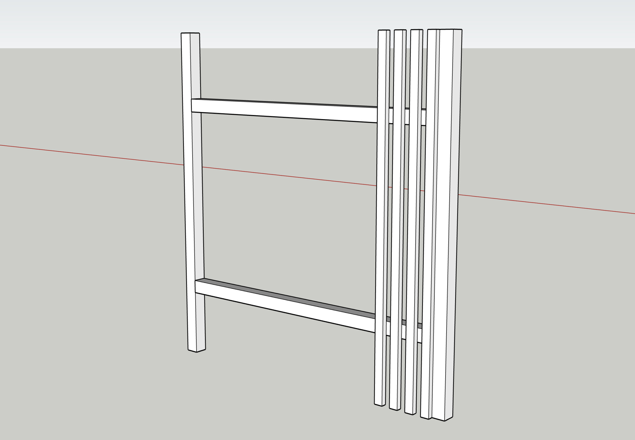 För resten av vindskyddet är det då tänkt att sätta liggande stolpar (förmodligen med vinkeljärn under och över), två per mellanrum. Sedan ha stående ribbor. Typ: