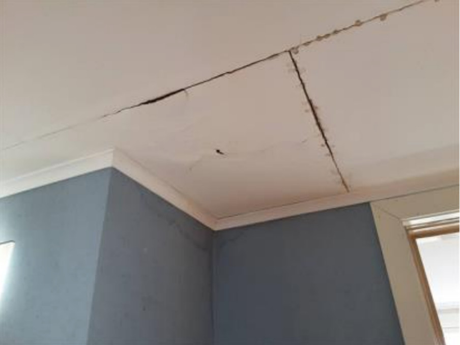 - Badrum: gammalt, antagligen 60-tal. Gjutjärnsbrunnen har rostat sönder. tydlig vattenskada, mattan har rest sig. Badrummet på ovanvåning men skada ses på innertaket på våningen under. (bild)
