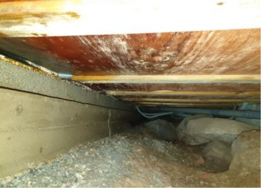 - Torpargrund, avfuktare trasig. Synlig mikrobiell tillväxt och fuktkvot 28% i trä. (se bild)