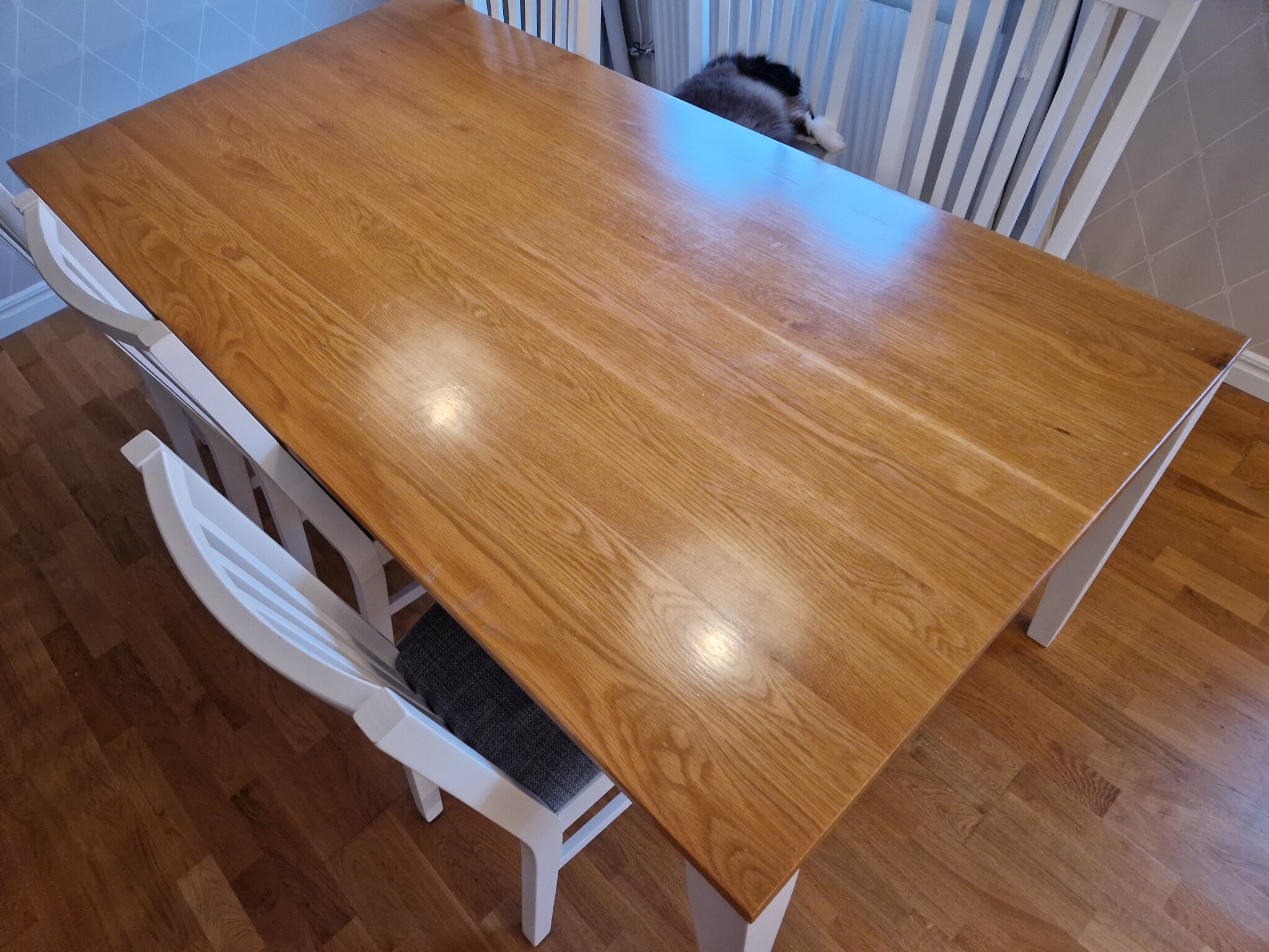 Eftersom det är ett matbord vill jag helst undvika starka kemikalier, även om det annars hade varit en bra idé.