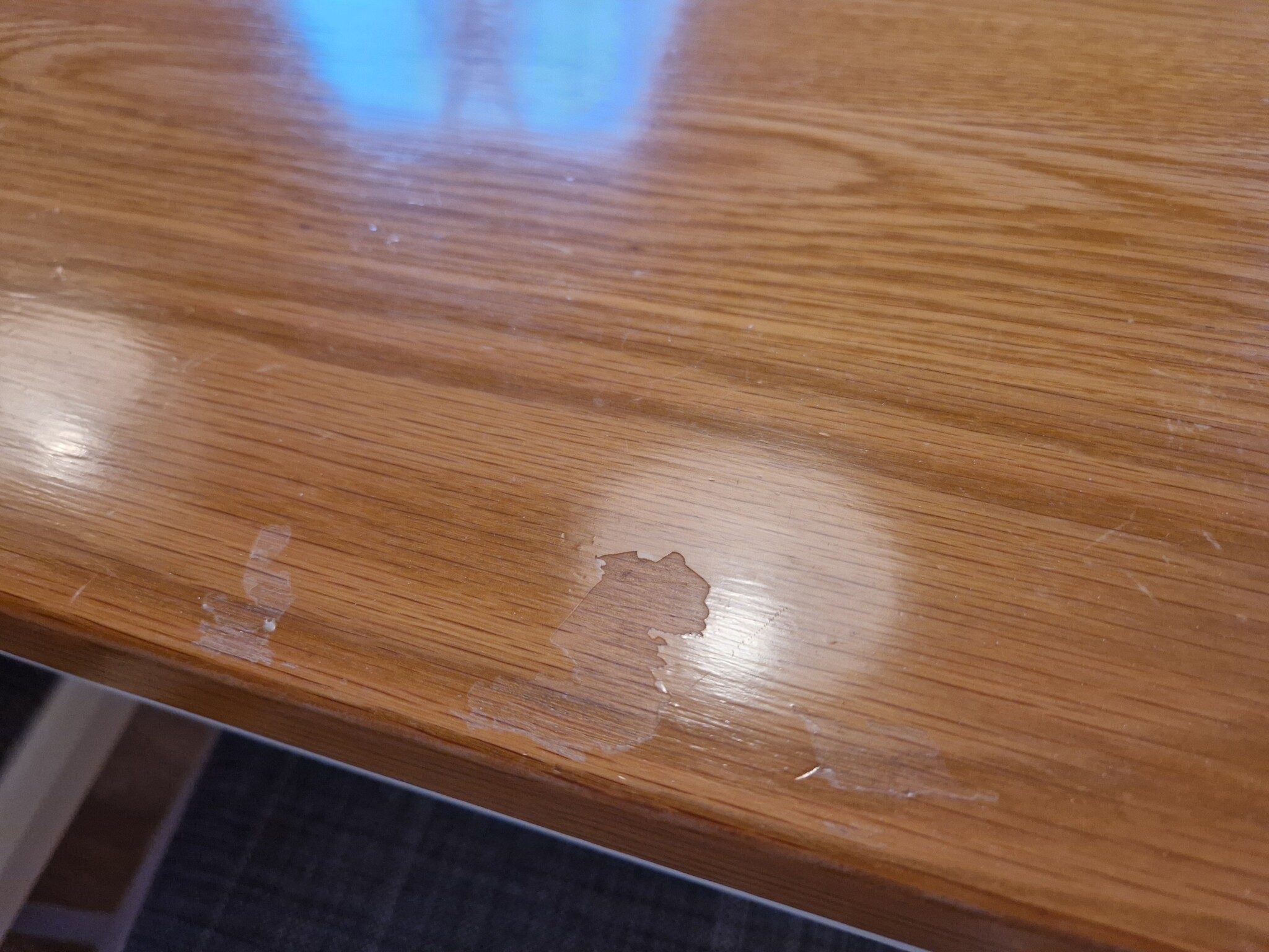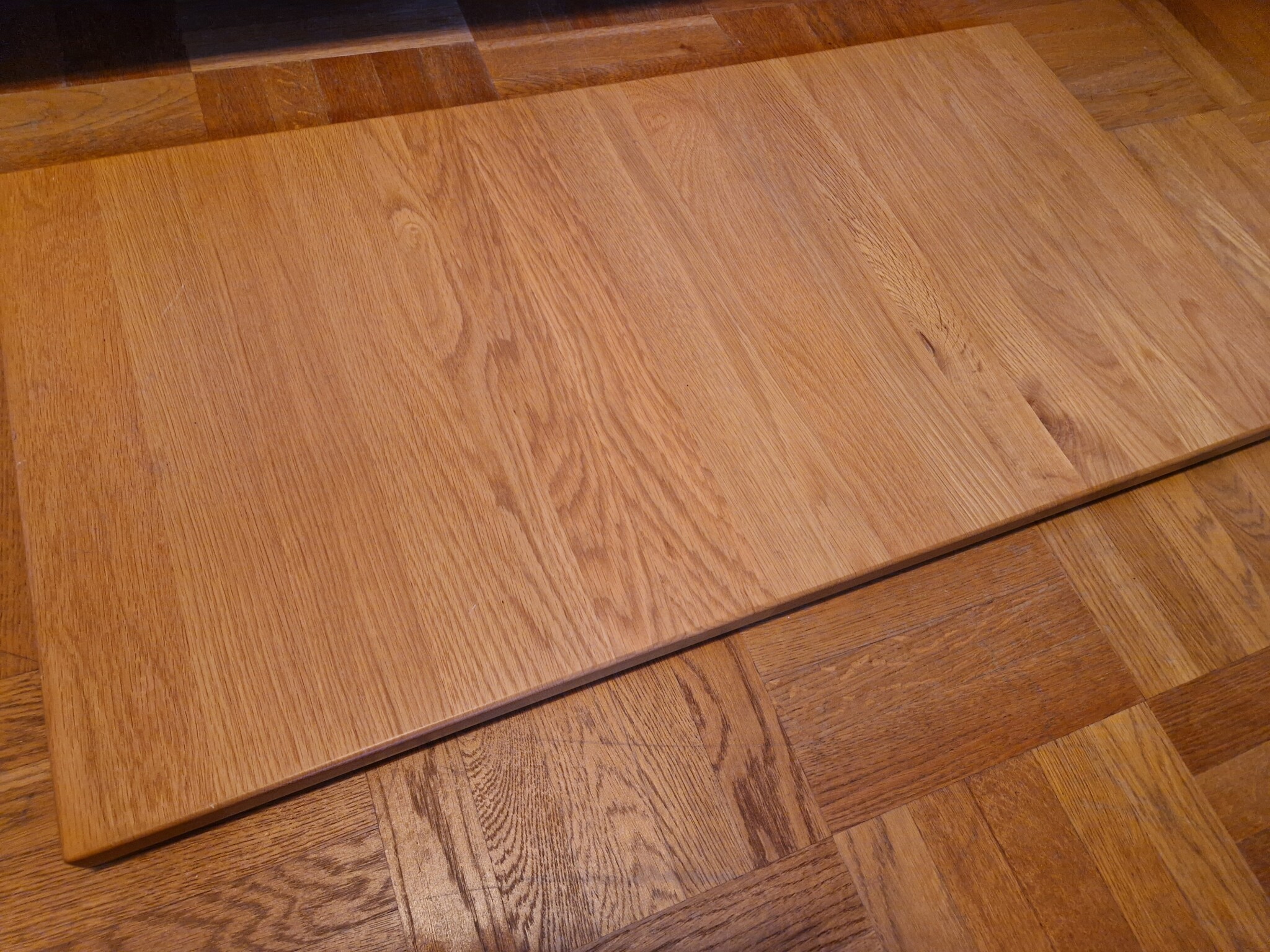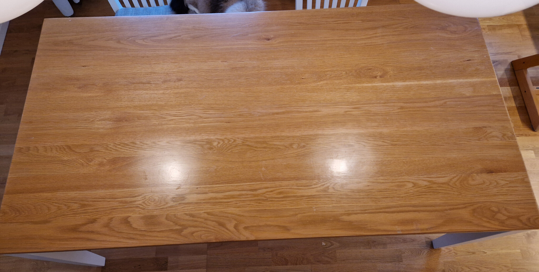 Bordsskivan har tidigare slipats och lackats med golvlack (Trestjerner), vilket visade sig vara ett dåligt val – det höll inte särskilt länge. Vi misstänker att det kommer krävas mycket arbete för att slipa bort denna lack.