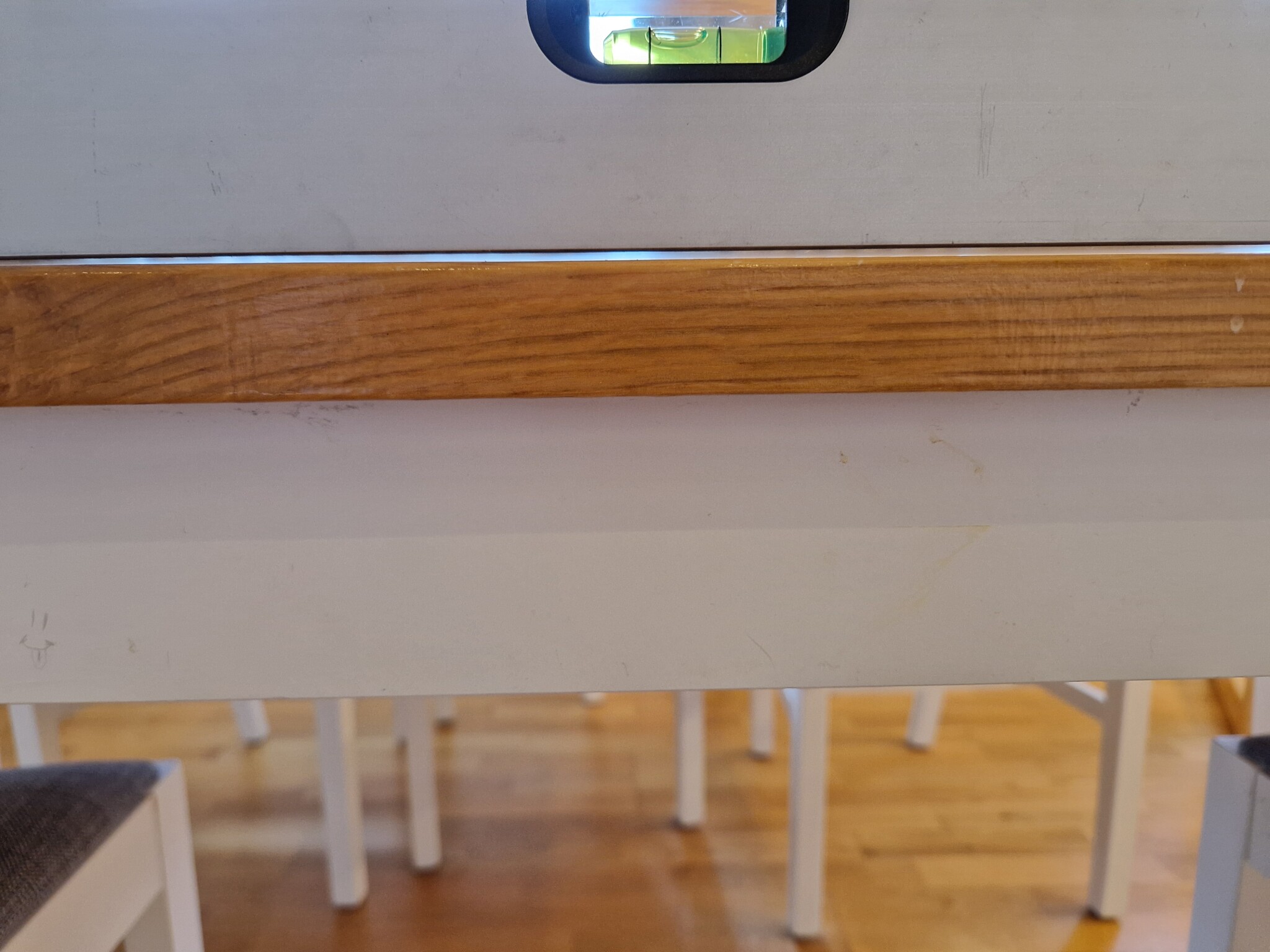 Skivan är inte rak, vilket syns tydligt på flera bilder. Variationerna slår i så gott som alla led. Små variationer på några millimeter är inte ett stort problem, men i vissa fall skapar det synliga glipor, till exempel vid bordsbenen. Eftersom trä är ett levande material är det vanligt att det böjer sig, men vi har svårt att bedöma om detta ligger inom rimliga gränser?