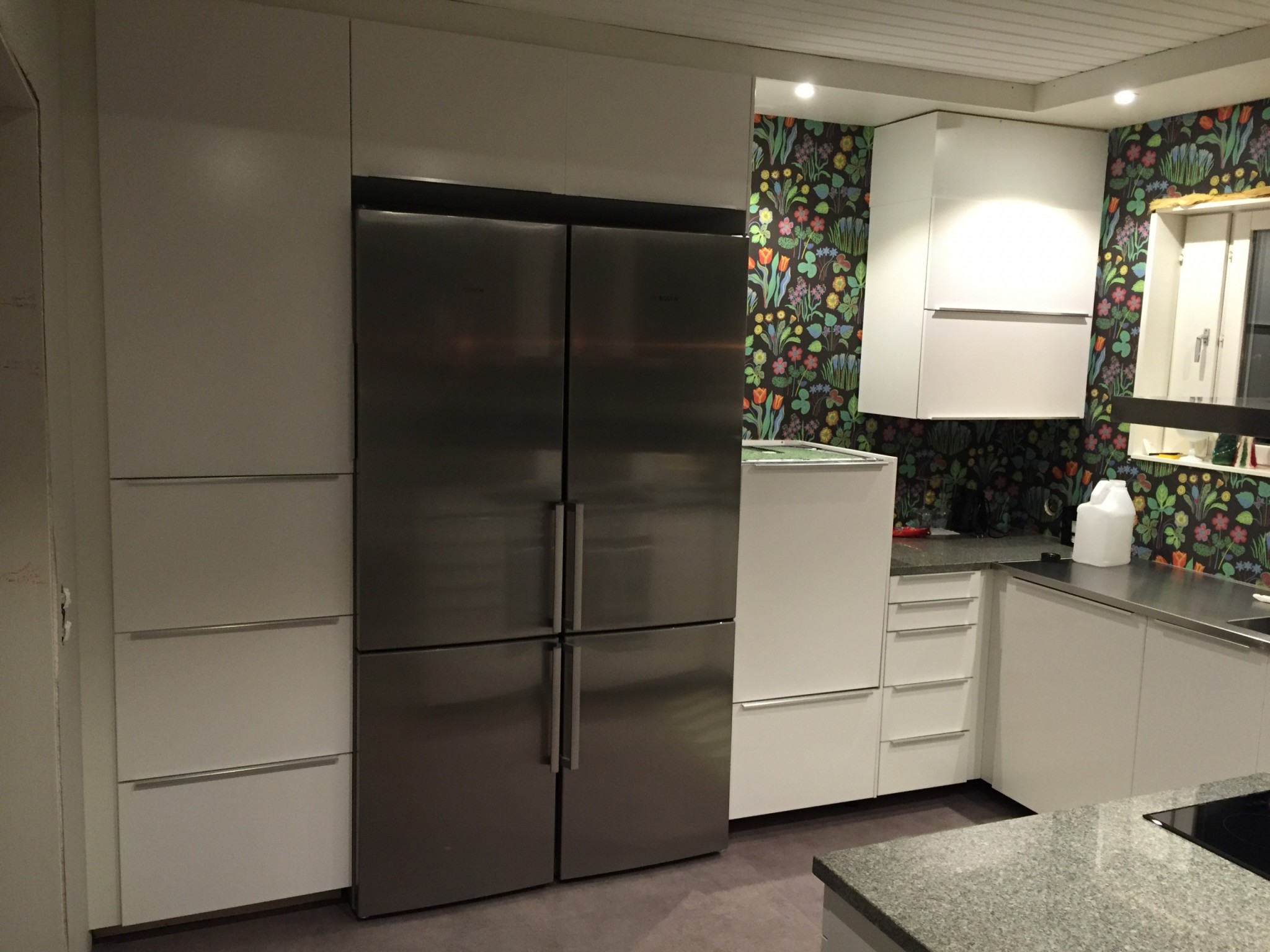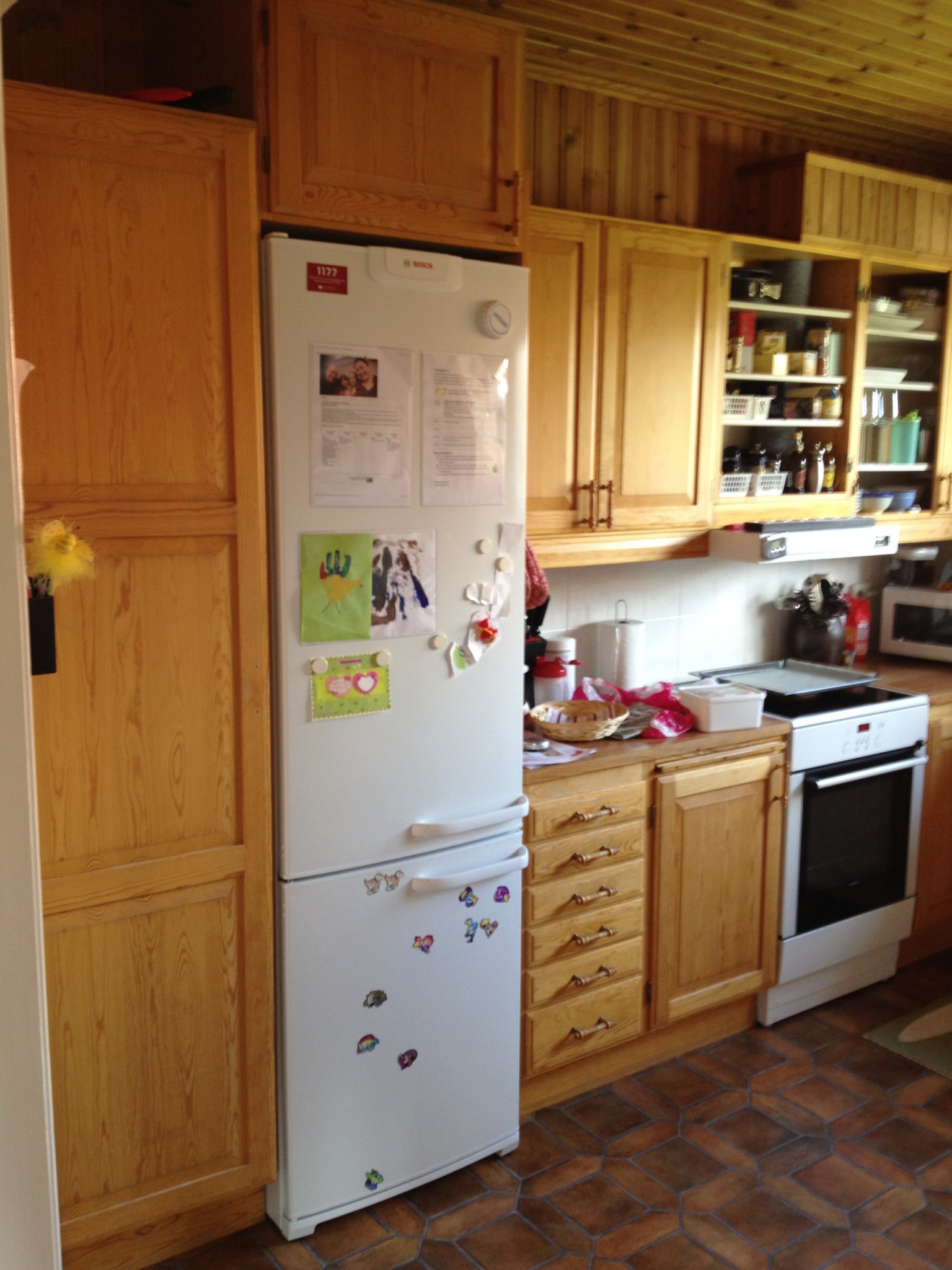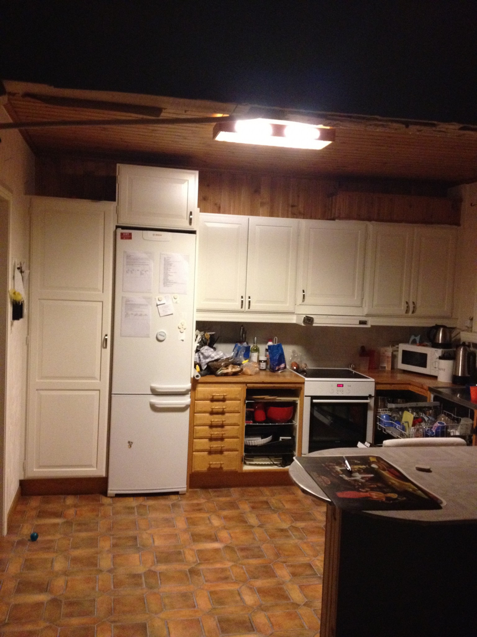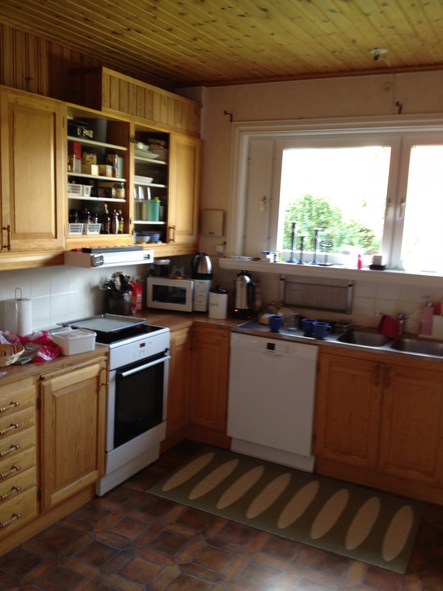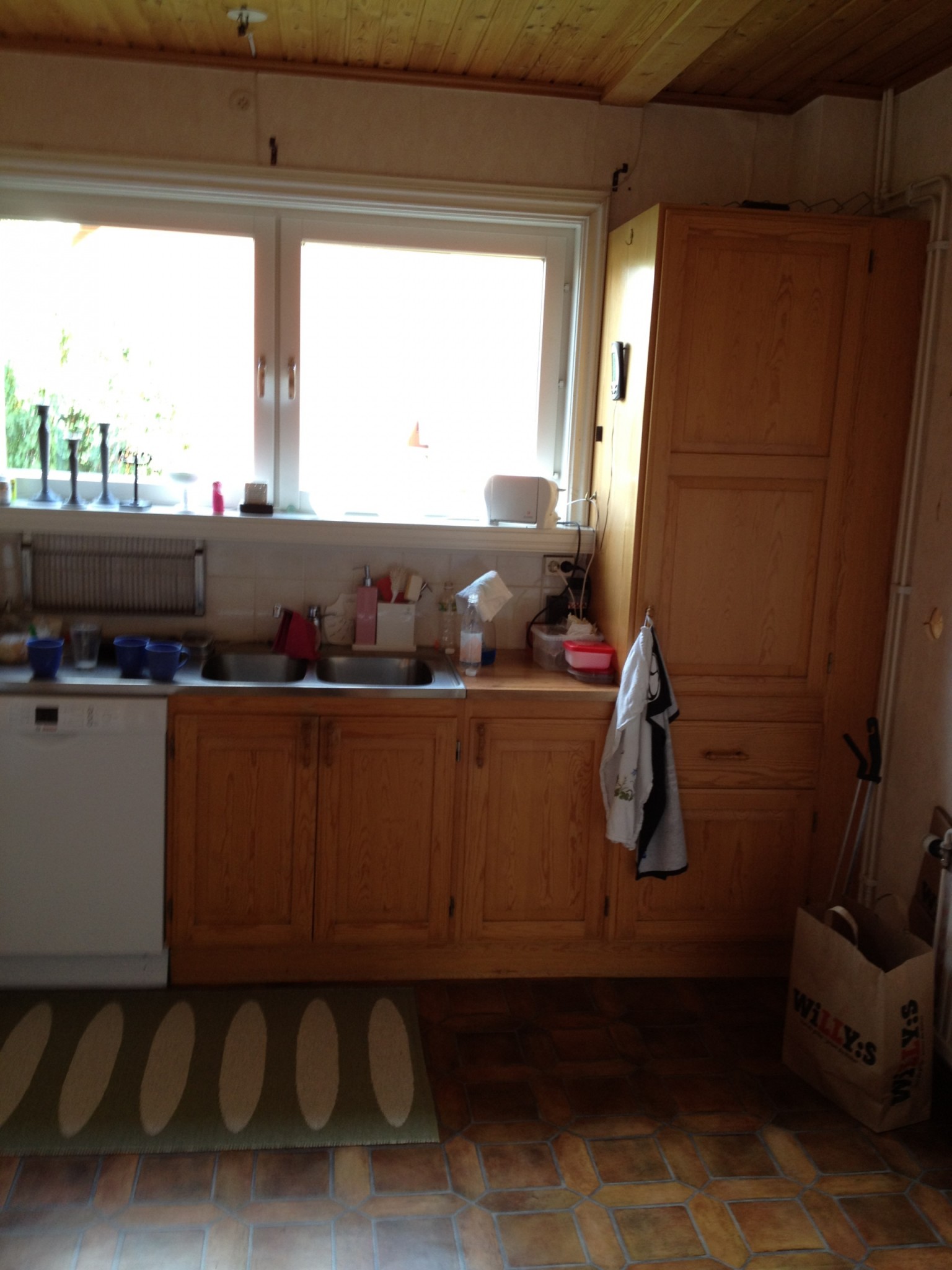 Köket är Ikeas Veddinge. Diskbänken är måttbeställd från Agelito. Kyl/frysarna är Bosch. Fläkt och spishäll Cylinda. Ugn och diskmaskin från Ikea. Dimmers på belysningen i hela köket. Saknas en stenskiva ovanpå diskmaskinen samt lite lister kring fönster, dörröppningar och tak. Stenskivan kommer från Norrsten här i byn, Grå Bohus.