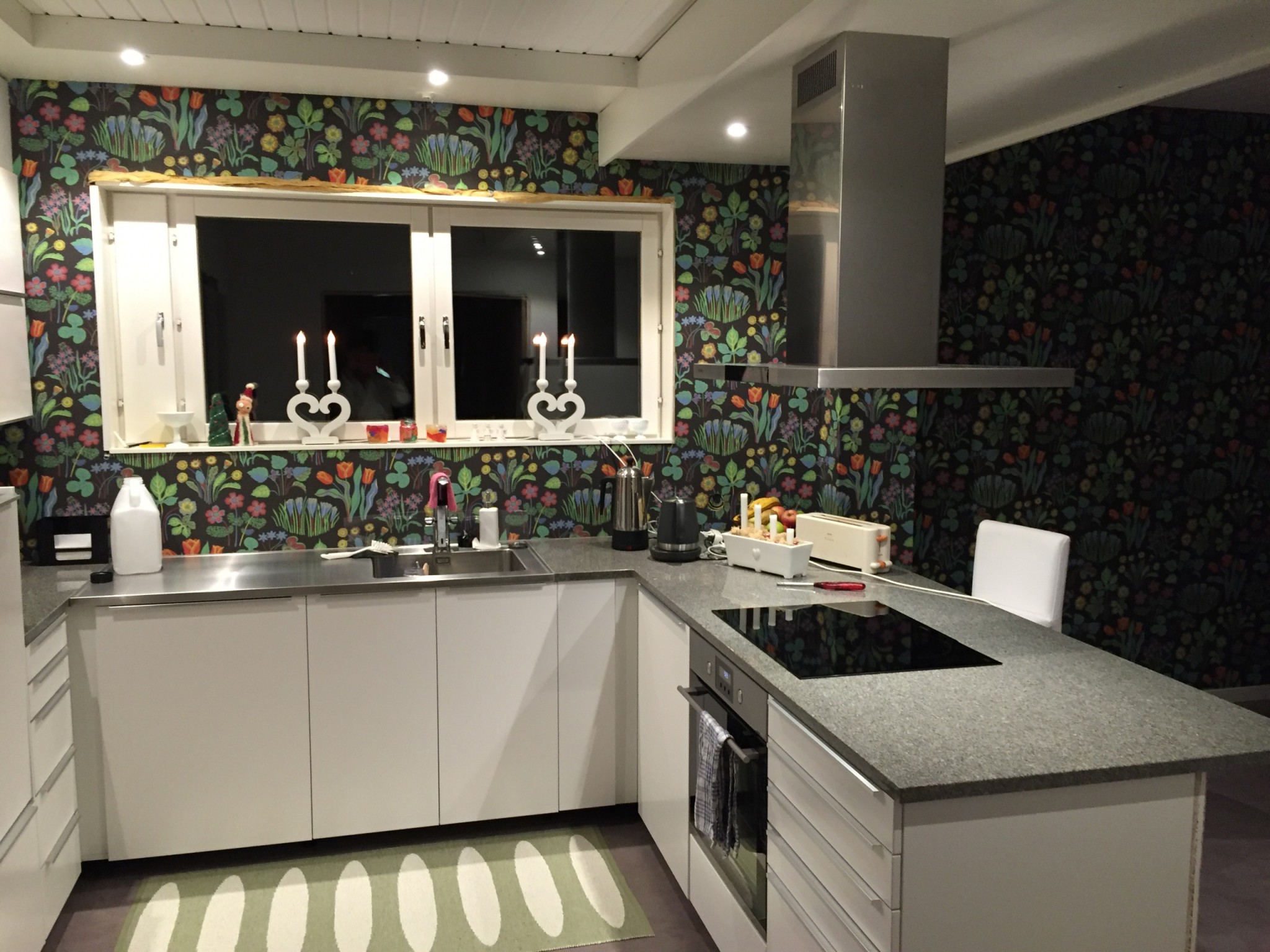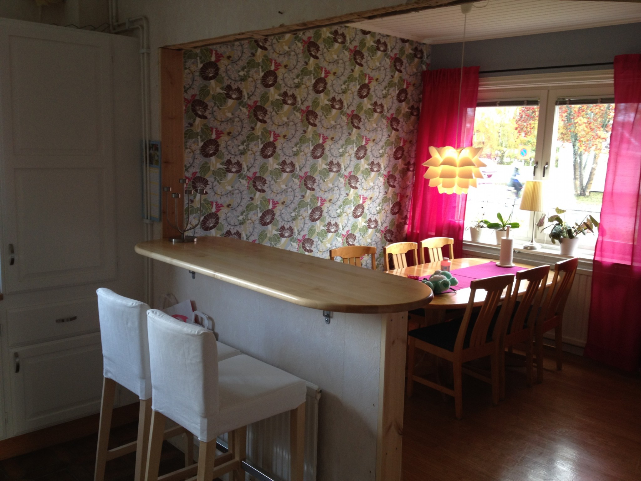 "Lådan" i taken ovanför halvön rymmer både fläktkanal samt maskerar det faktum att taken hade lite olika höjd i de två rummen även om det var likadant. Döljer också balken som sitter där då köksväggen är flyttad en gång tidigare i samband med förra köksrenoveringen.