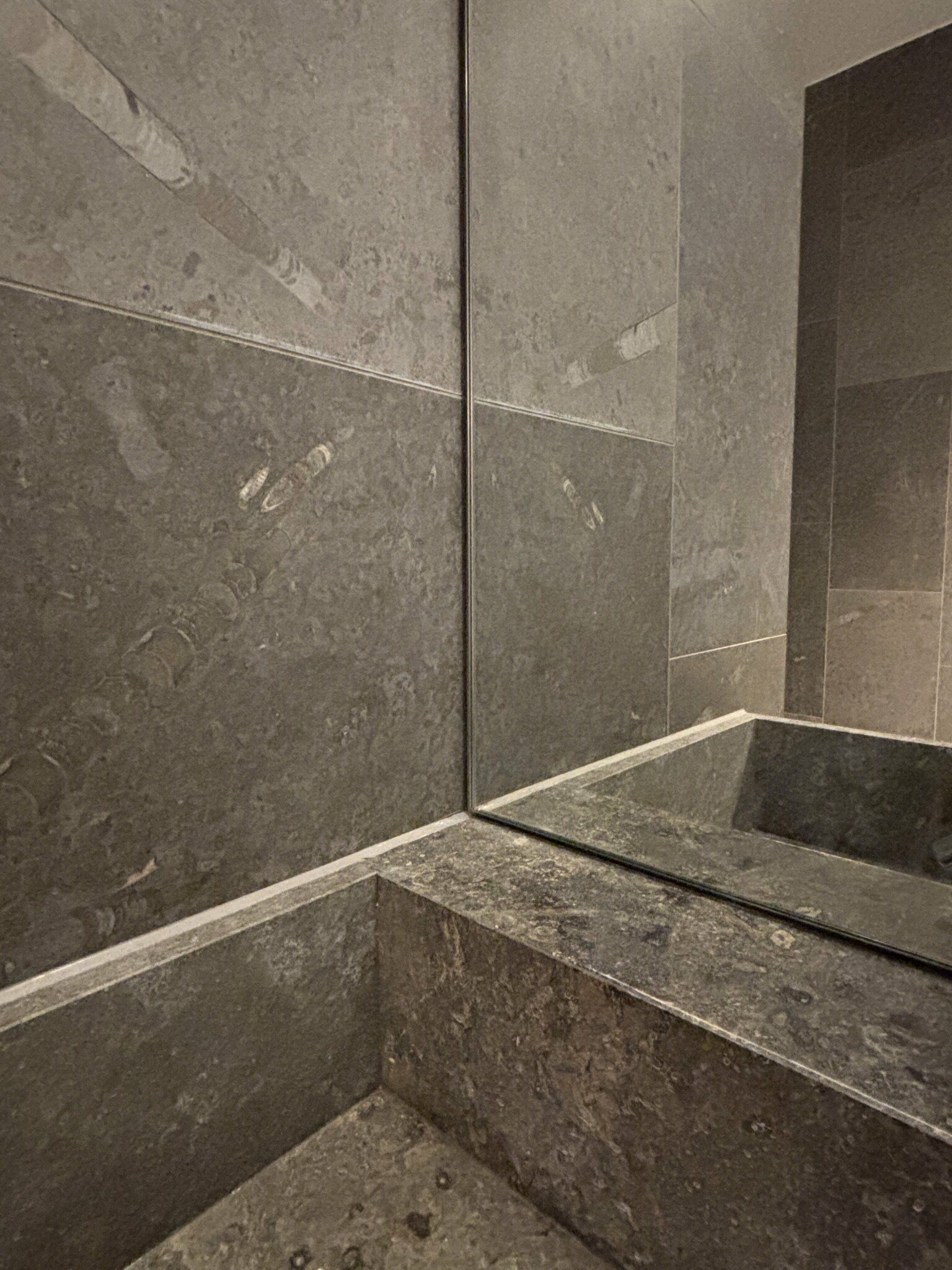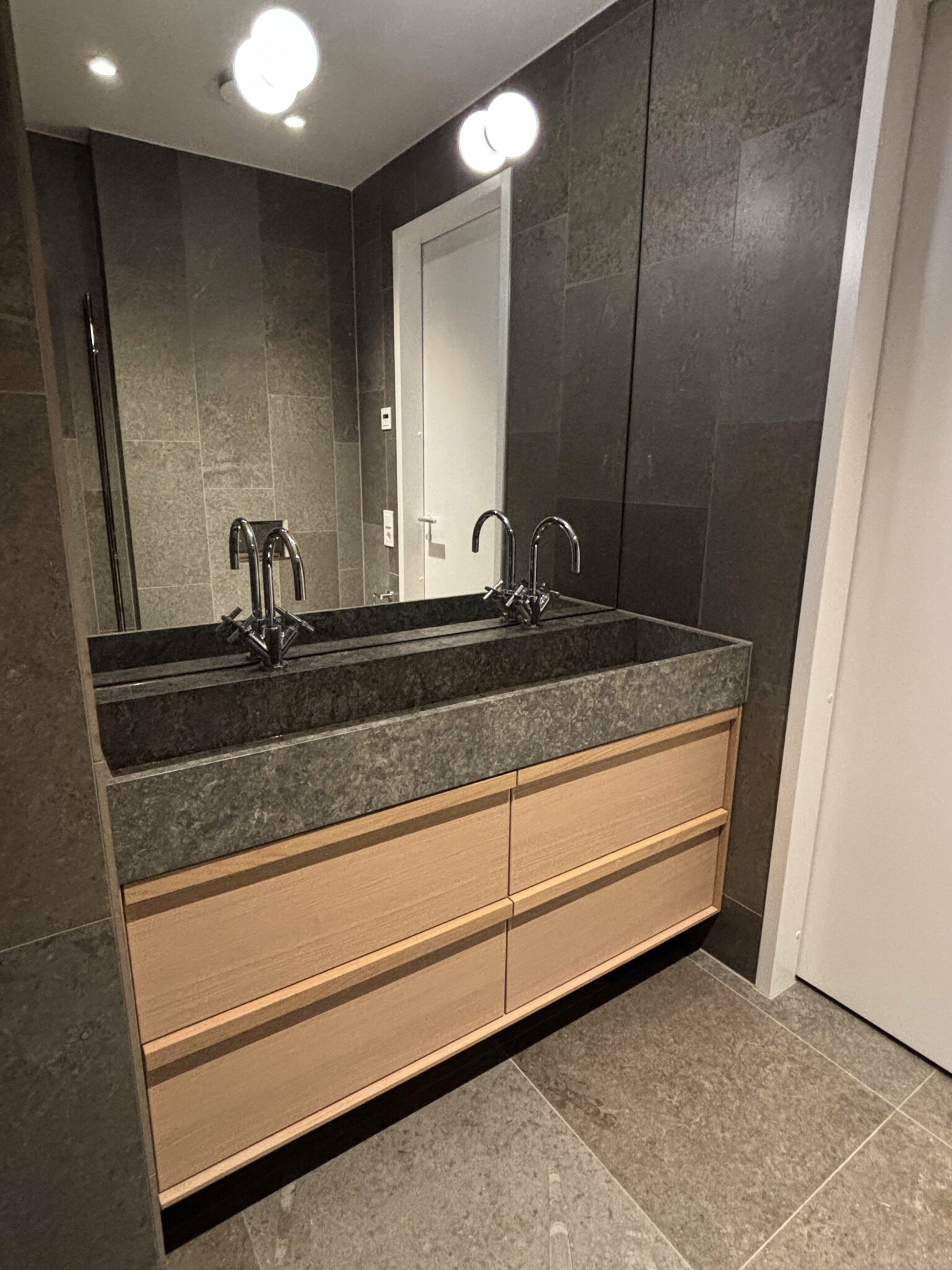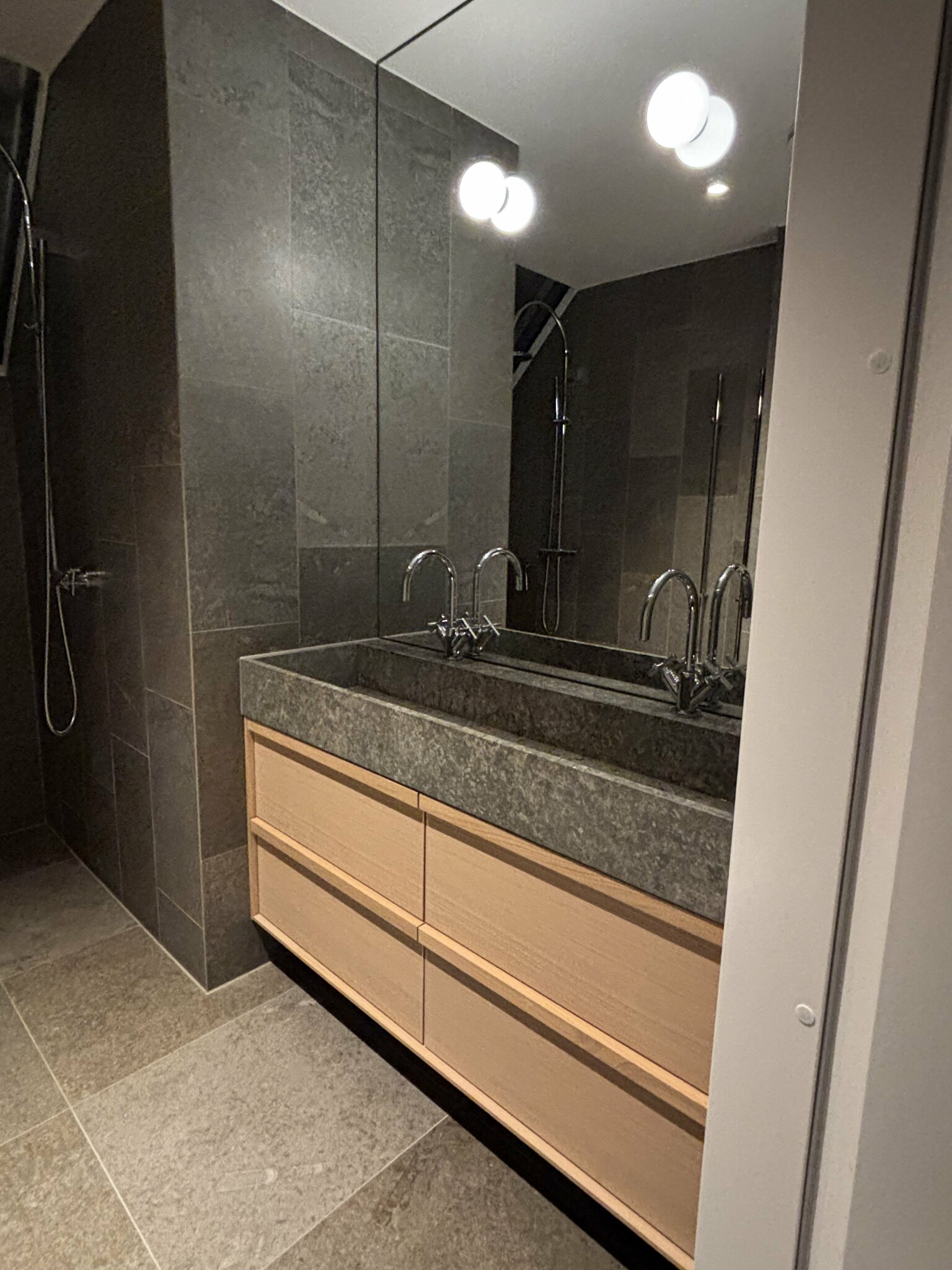 Köpte en färdig 140kommod som väggarna byggdes efter för att den skulle glida in preciiiiis. Sen så blev det riktig ölandskalksten som stenhuggaren tillverkade (cred till honom som är bäst på alla sätt o vis). Det var inte lätt att få ihop allt detta när måtten var så sjukt tighta att få in kommod, sten och spegel och dörren redan var monterad som ni kanske minns råder 8mm utanför kaklet