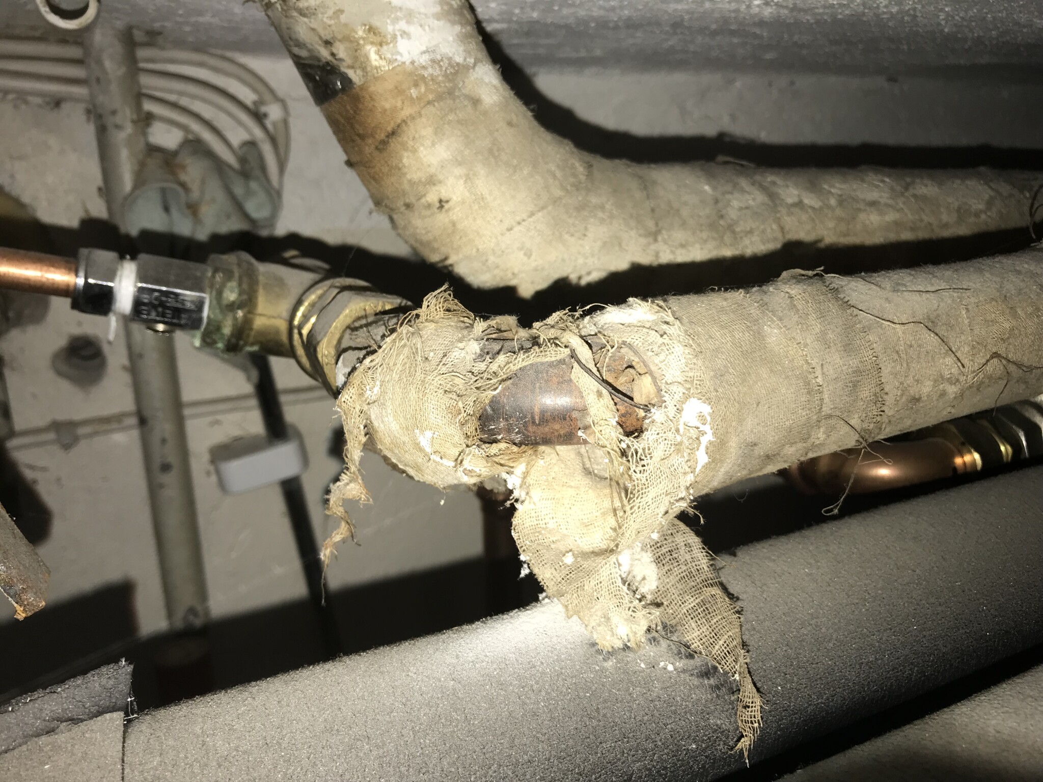 Som jag förstått det så använde man asbestmassa direkt på rören och sedan gips och väv/ gasbinda ytterst?