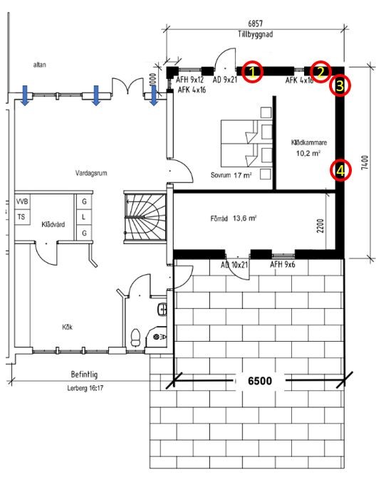 Vart bör jag placera tilluftsdon i våran tillbyggnad, se bifogad bild? Vi har idag en frånluftsvärmepump med frånluft i kök/badrum och tvättstuga.