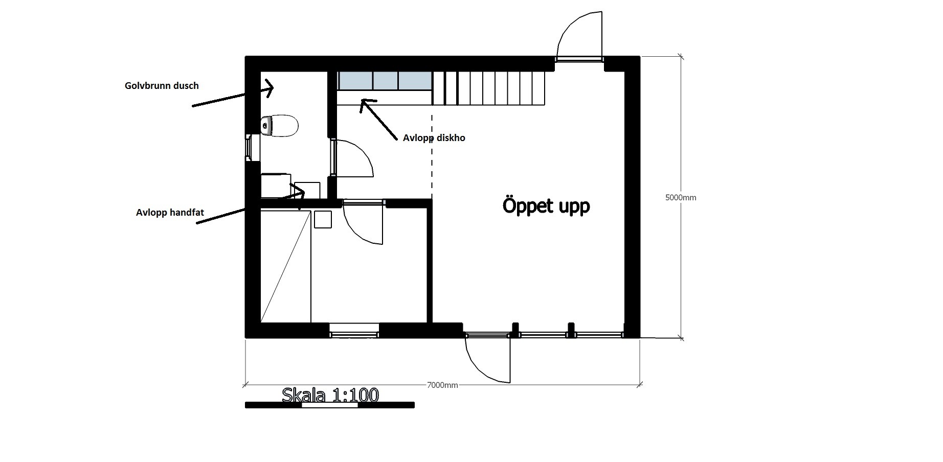 Vi skall snart få besök av en markfirma som skall hjälpa oss med markarbetet inför bygget av en grundplatta på 35 kvadrat. Jag tänkte att de skulle få dra in en avloppsstam i grusbädden som jag själv förgrenar i frigoliten till de olika avloppen i plattan. Men vart drar man bäst in denna stam för att göra det enkelt med förgreningarna sen? Nedan har jag klistrat in planlösningen och dragit pilar till de olika avloppen.Tacksam för tips