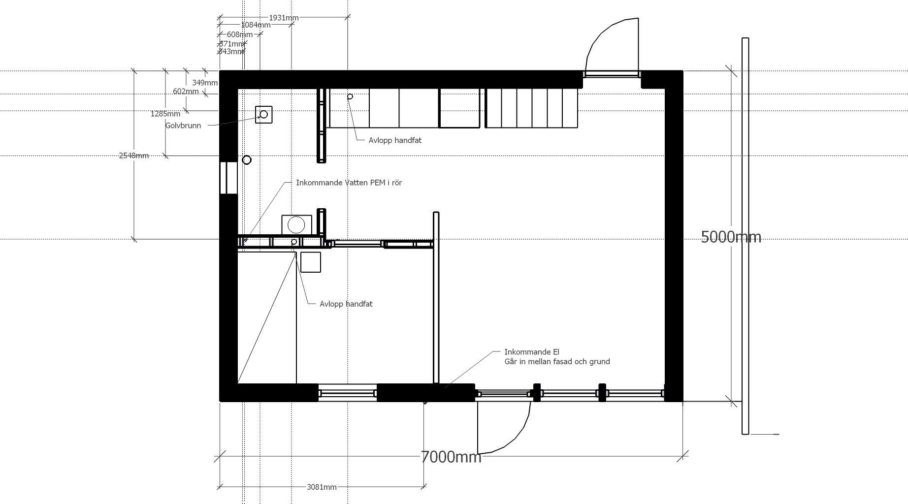 Jag gjorde en måttsatt ritning. Jag förstår om det kan vara svårt att bedöma den men jag har försökt att utgå ifrån säker vatten och placera avlopp till toalett minst 60 mm (80 i min ritning)från vägg och golvbrunn minst 200 från vägg (275 i min ritning). Avlopp till handfat i badrum går genom innervägg. Samma gäller inkommande vatten som jag placerar i fördelarskåp infällt i vägg. Tappvatten drar jag i installationsskiktet eller via bjälklag i loft till köket. Vad tycker ni om ritningen?