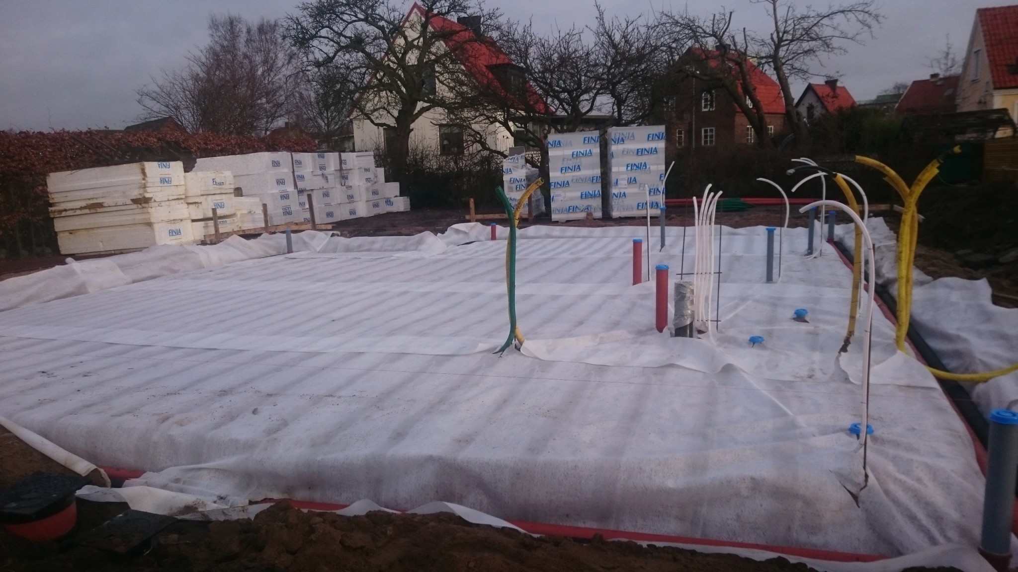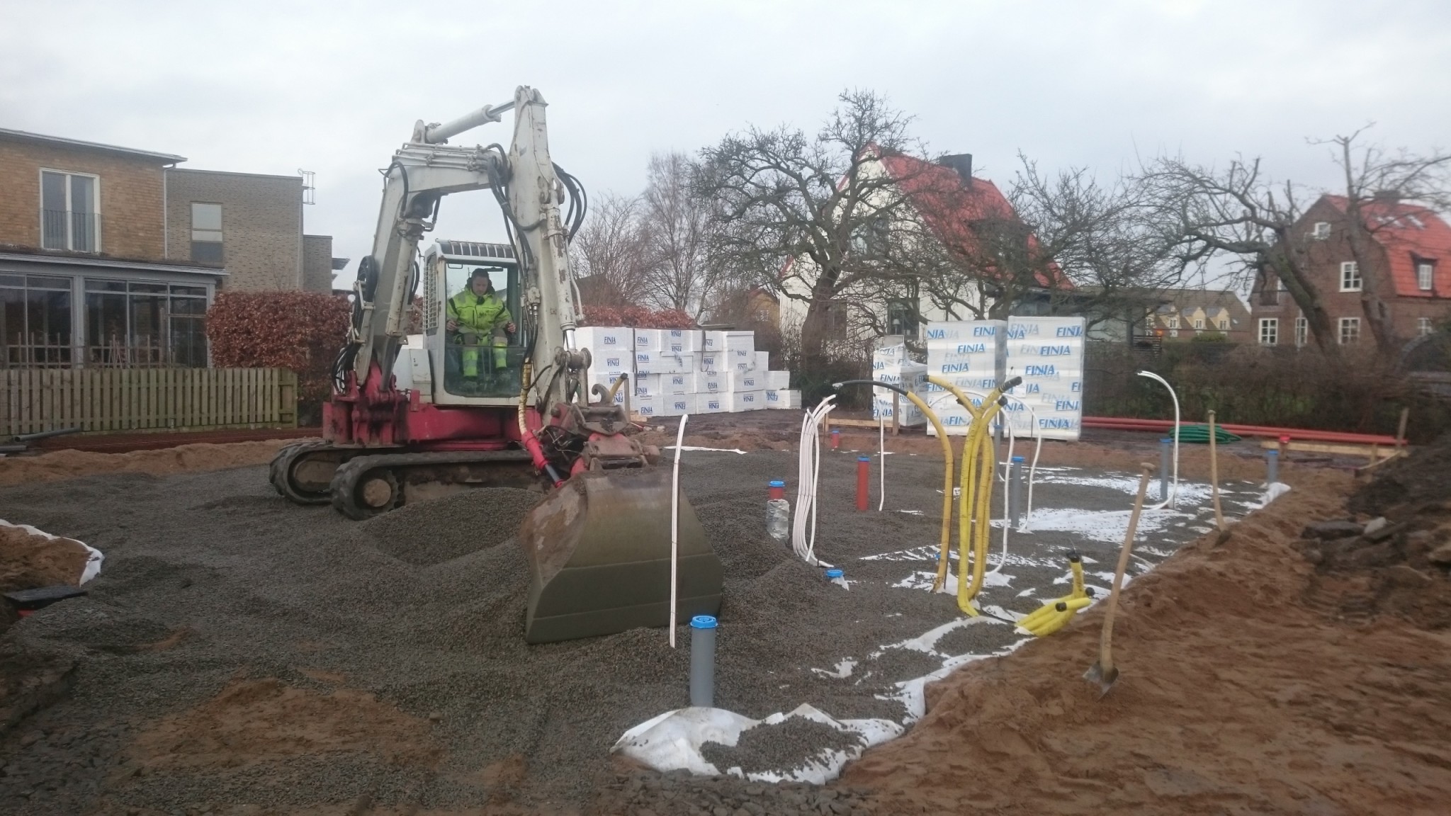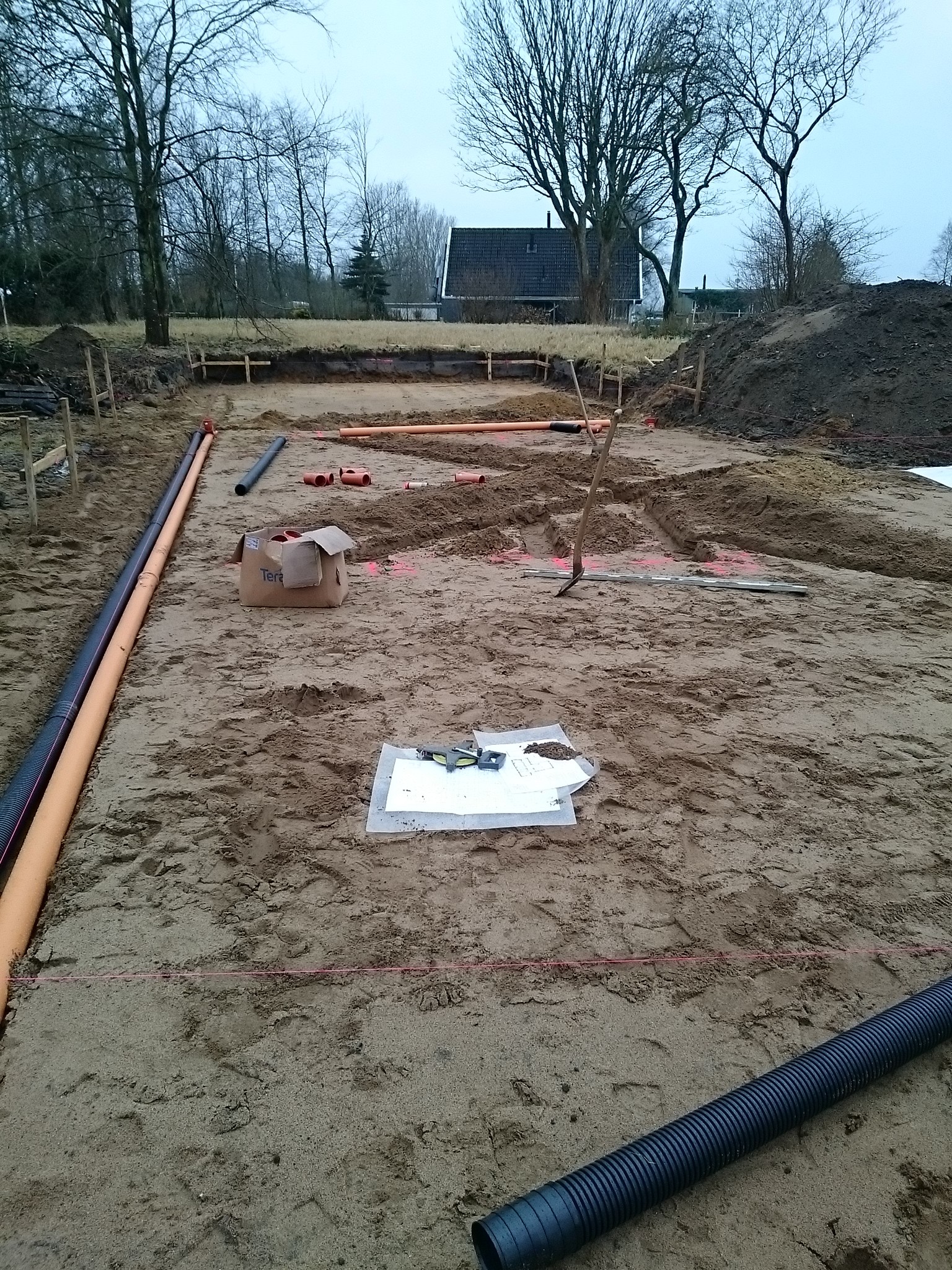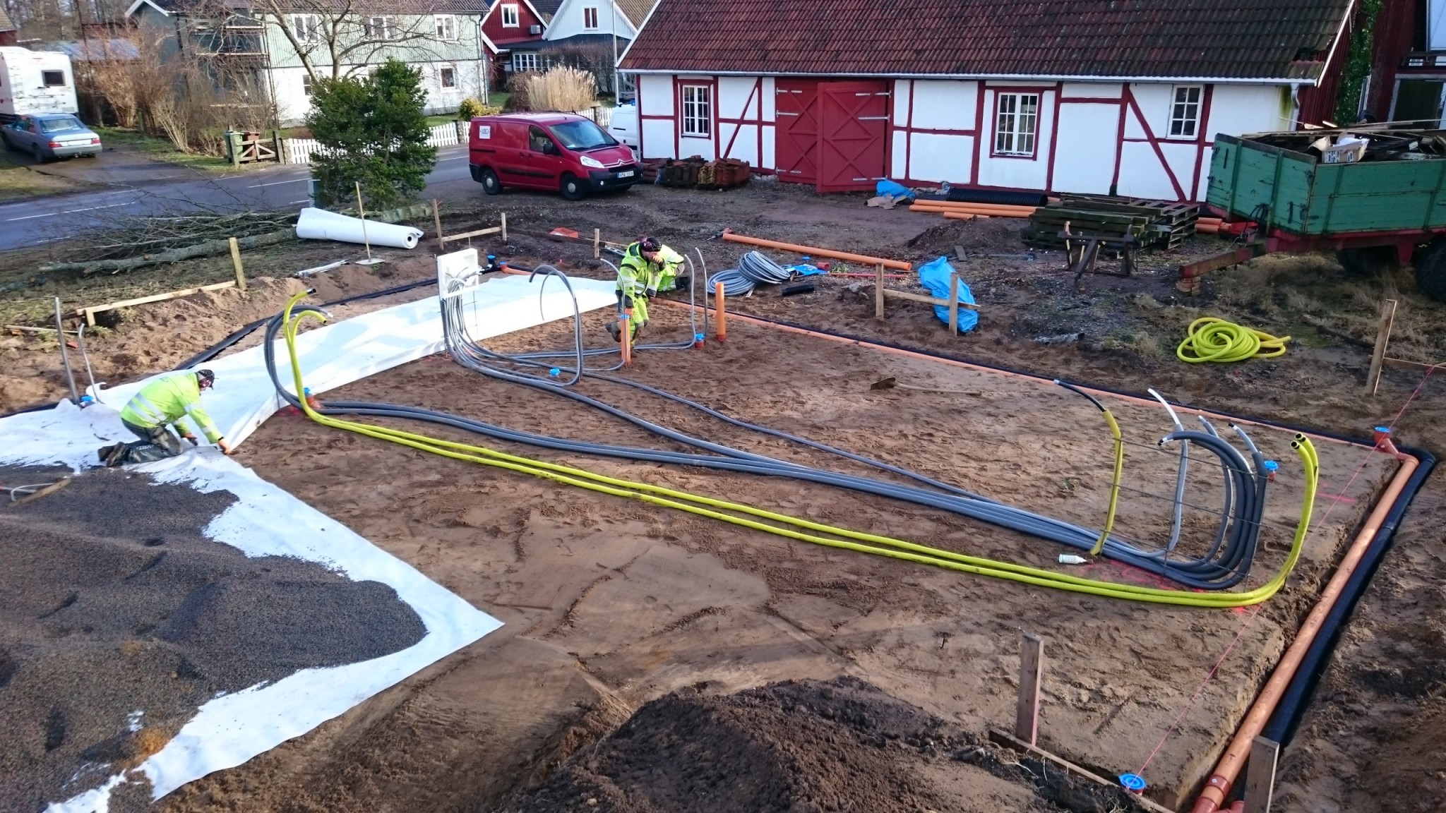 Vi brukar lägga avlopp i sanden vi packar upp med, alltså lagret innan singel. Samt ovanpå sanden lägger vi tappvatten, samt viss el om där skall dras in 50mm elslang osv.