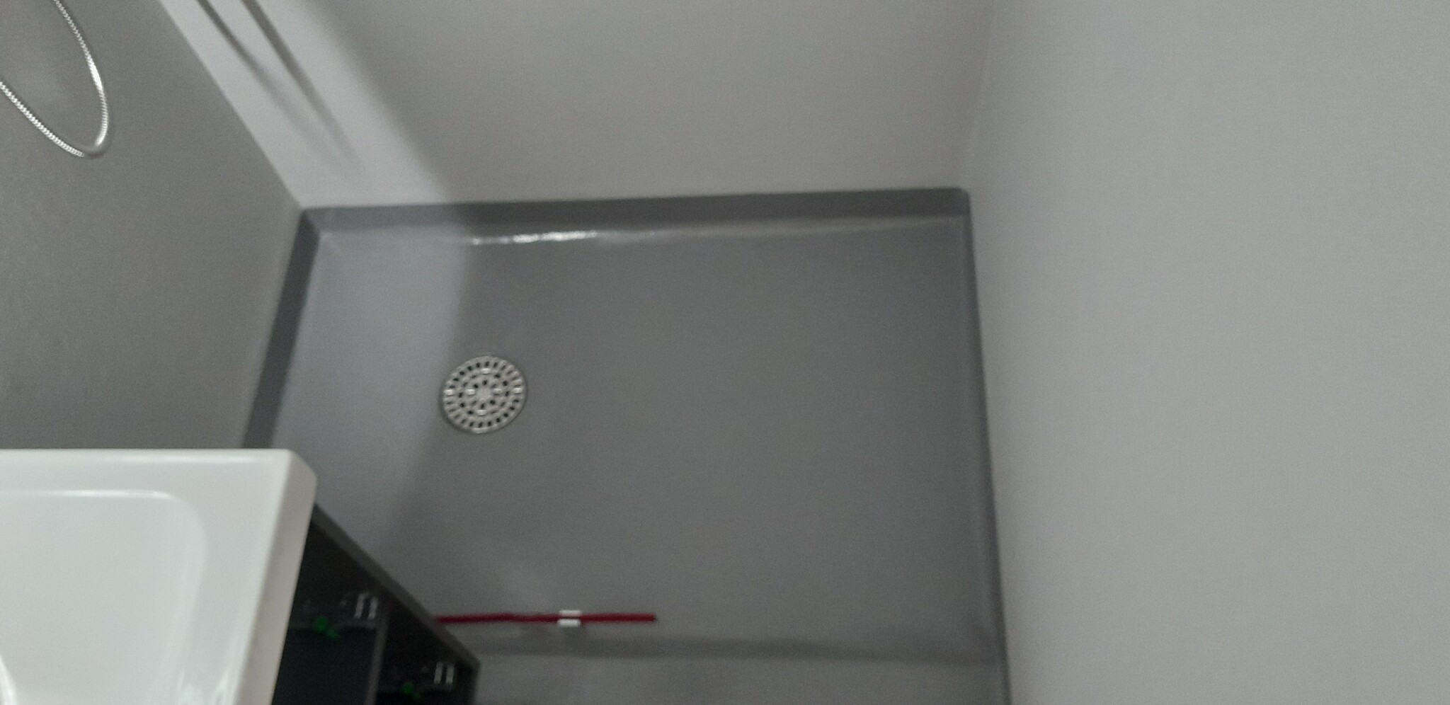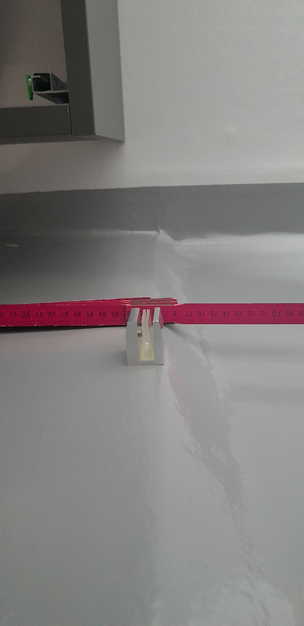 Det finns en tydlig skuldra i golvet, sätter jag väggen under skuldran så lutar golvet en del och det kommer bli svårt att limma stödet. Det blir också mindre(73cm) utrymme att duscha på.