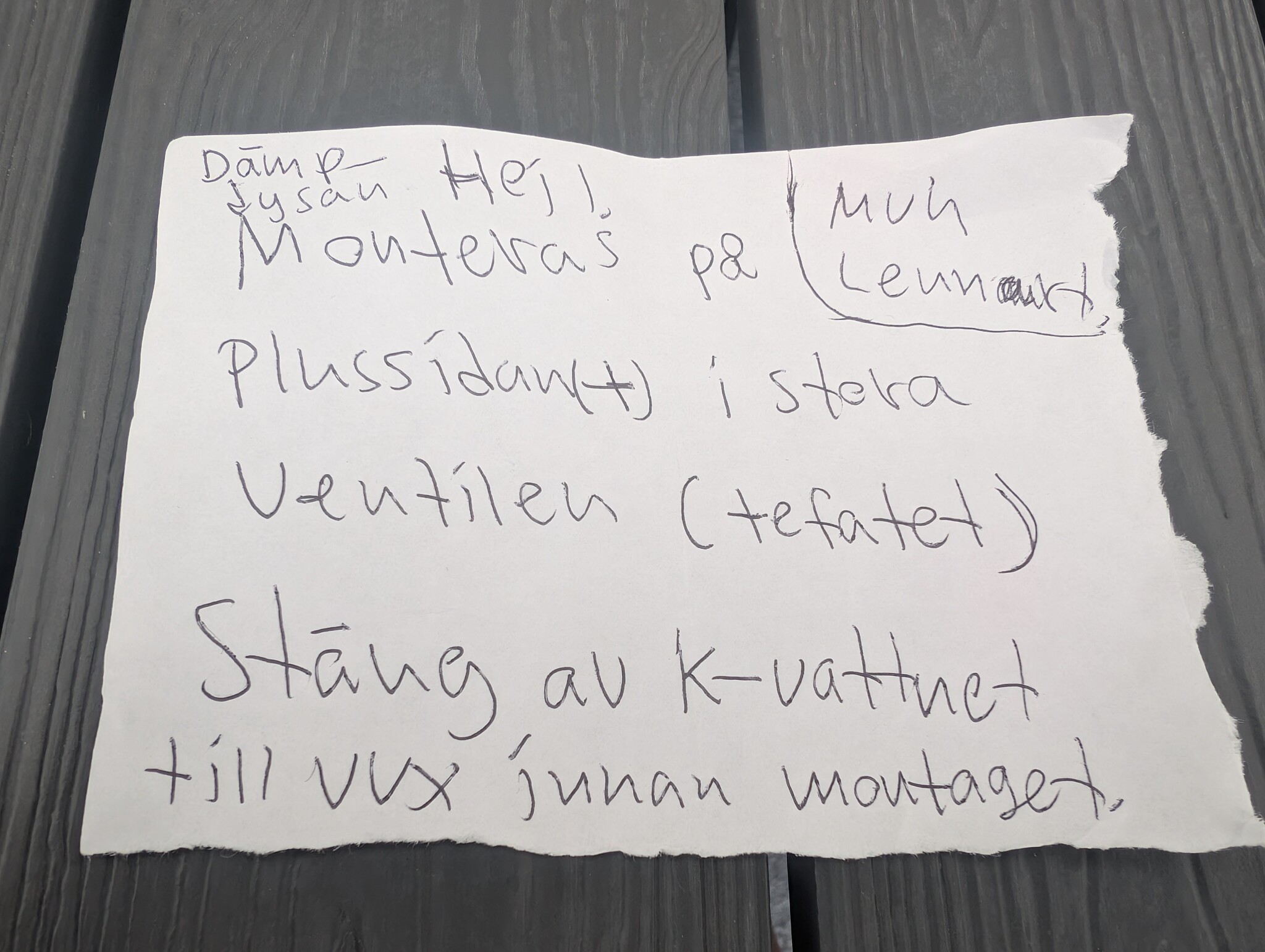 Några dagar senare fick vi en lapp och en liten "hylsa" av något slag. Vi förstår inte vad Lennart menar med denna otydliga lappen men finns det någon som förstår och som vet vad man kan göra åt att det slår så mycket i rören som stör oss och grannarna.