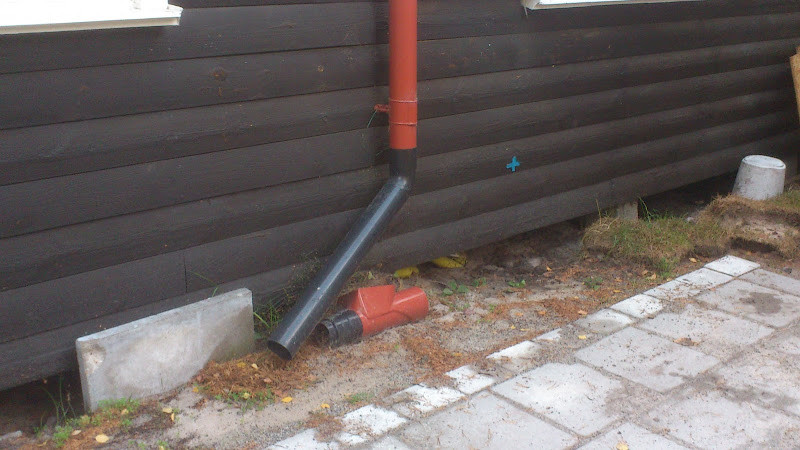 Jag har grävt upp längs huset o lagt in kommunalt avlopp, får dock inte koppla på stuprören! Marken består av vit sand.som sväljer vatten. Sen jag gjorde om har jag även lagt en gång med sten o nu rinner allt vatten rakt ut på marken o in under huset. Det står på plintar men jag vill inte ha in allt vatten där.