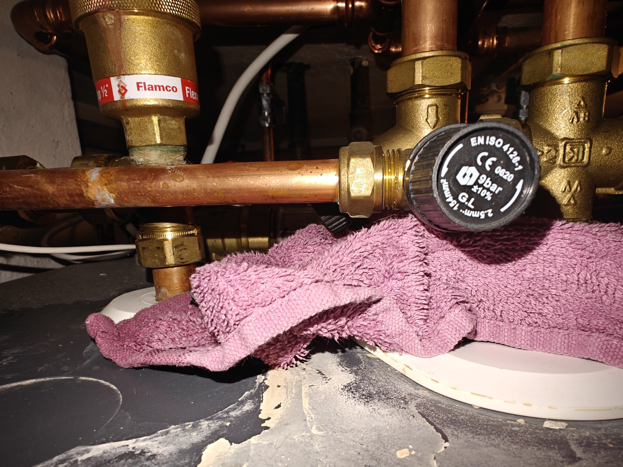 Jag har vattenansamling på ovansidan av pumpen, tror det kommer från den svarta ventilen, se pil bild 2, (eller runt den) då varmvatten bereds. Den svarta ventilen leder till ett rör (se pil bild 1) som mynnar ut i en golvbrunn. Vad gör denna ventil? Vrider man på den så kommer det luft och då sipprar det ut vatten ur röret ner i golvbrunnen.