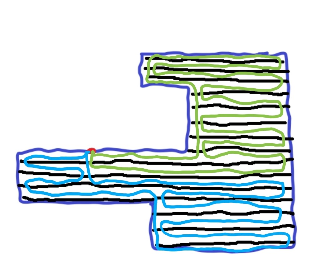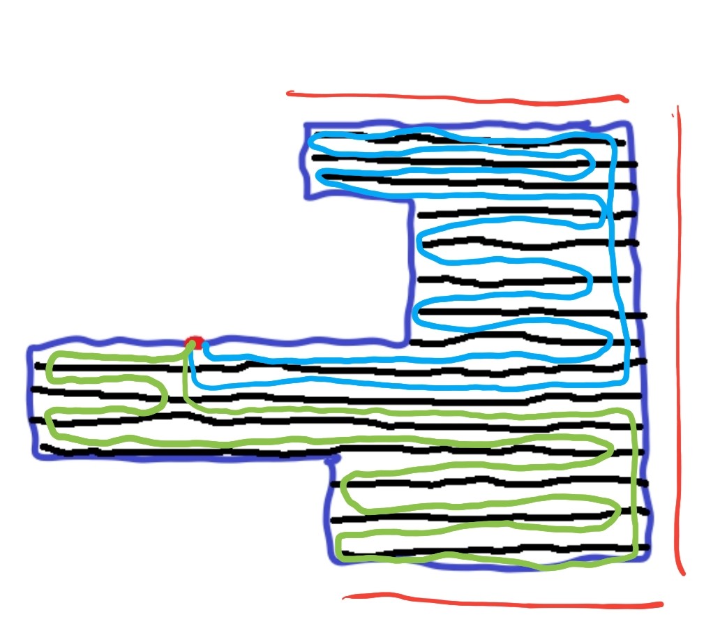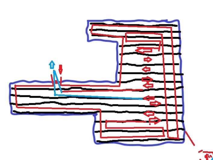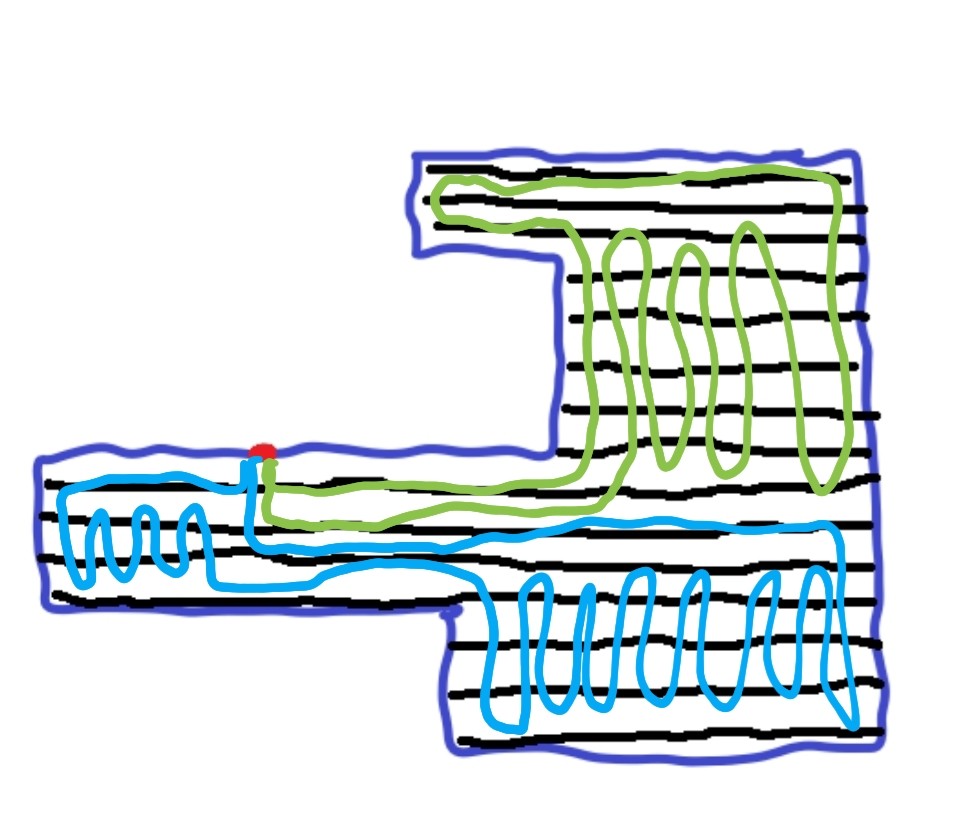 Jag behöver lite hjälp hur jag ska dra mina slangar för golvvärme. Golvytan är 32 kvadrat och jag tänker ha 2 slingor och kommer att använda 16mm slang. Slangarna kommer att läggas i träbjälklag se min halvdåliga skiss