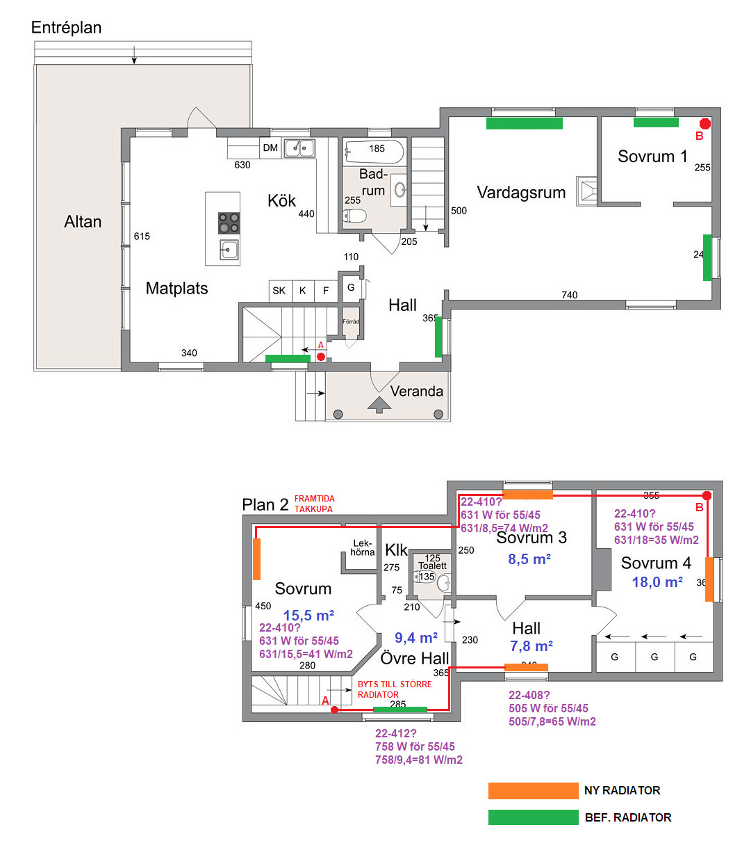 Den lila texten i planritningen har jag lagt till efter att ha fått deras offert med radiatorval som de gjort.