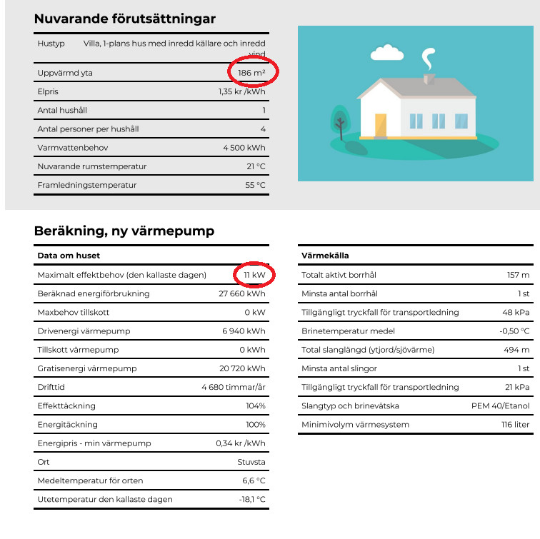 Om jag förstår det rätt är vår pump dimensionerad för ca 59 W/m2 (11000/186 enligt bild nedan)