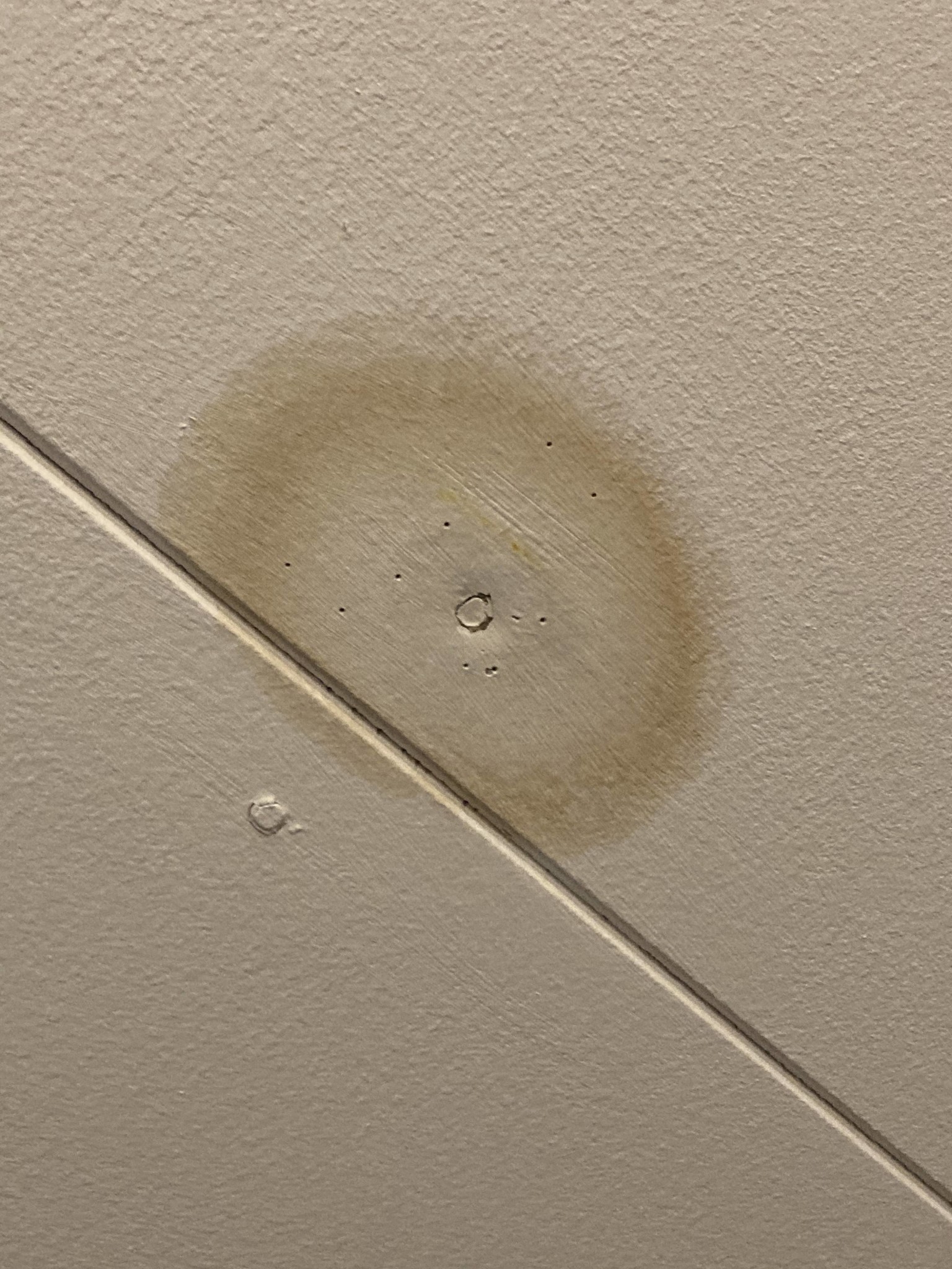 Ja fuktfläckarna är ju verkligen långt ifrån varandra vilket känns jättekonstigt. Jag får en känsla av att det läcker ganska friskt då. Droppade det på båda ställena vid något tillfälle? Läckan vid spotten, är det i sovrummet eller vardagsrummet? Den ser ju inte så allvarlig ut jämfört med den andra med tydligt mörk fläck.