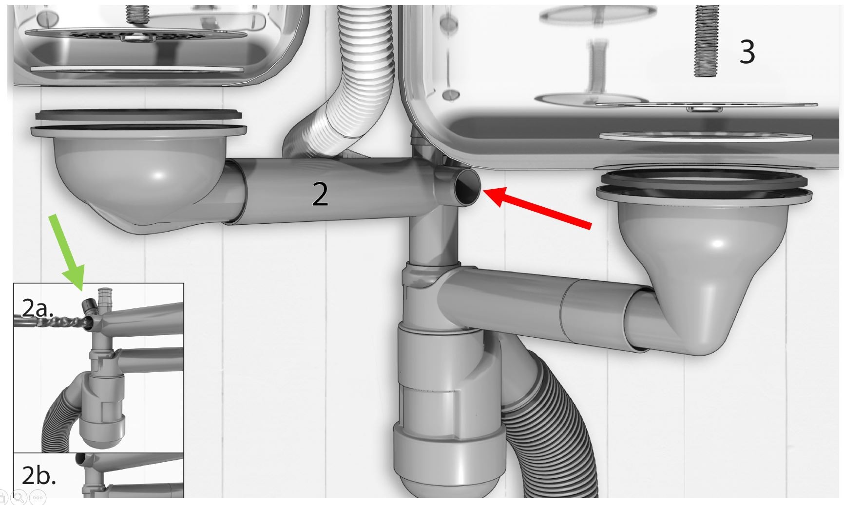 Hej, jag var nog lite för snabb när jag installerade vårat nya vattenlås (mitt i natten, hm) och borrade (som 2a visar) upp båda hålen och kopplade in diskmaskinen vid den röda pilen och den vita på motsatt sida.