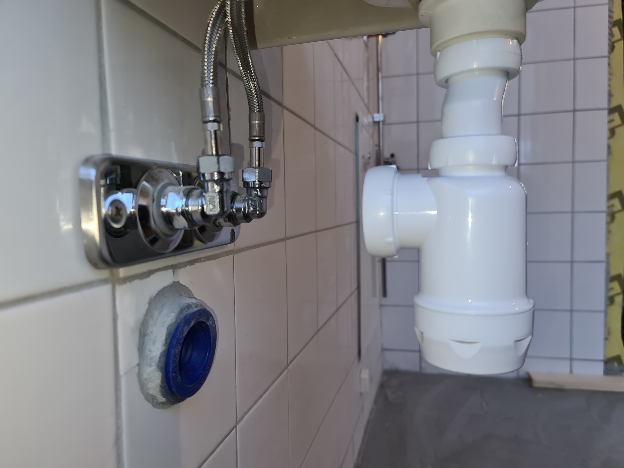 Visar sig att väggavloppet sitter väldigt långt ner i förhållande till handfatet. Så mitt tjusiga vattenlås nådde inte ned. Köpte ett standard vattenlås(Faluplast) i hopp om att det fanns tillräckligt med ljustermån i röret mellan handfat och vattenlås, men det är inte ens nära.